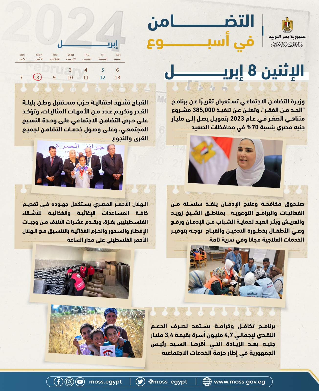 - برنامج تكافل وكرامة يستعد لصرف الدعم النقدي لإجمالي 4,7 مليون أسرة بقيمة 3,4 مليار جنيه بعد الزيادة التي أقرها السيد رئيس الجمهورية في إطار حزمة الخدمات الاجتماعية.