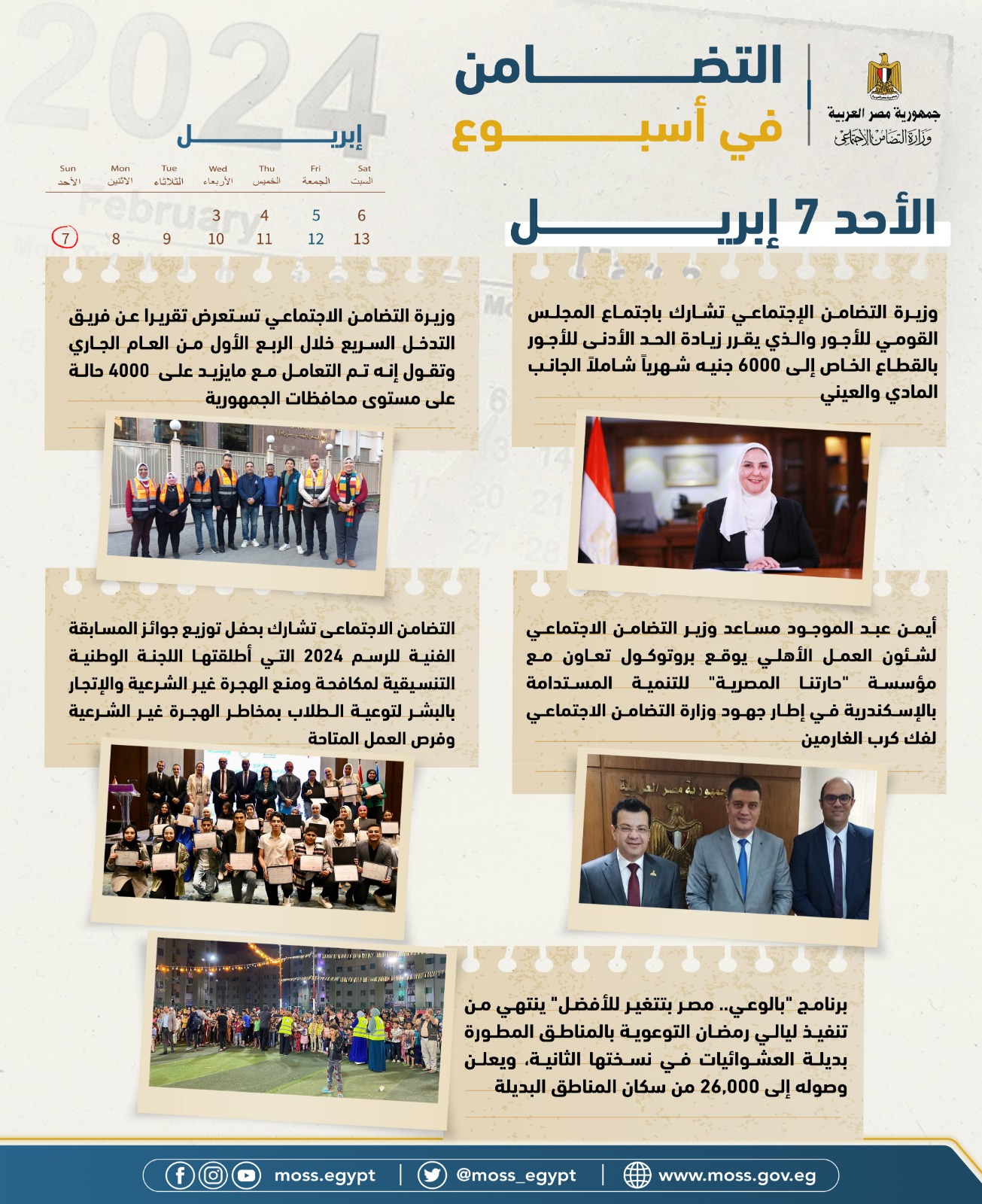 - وزيرة التضامن الاجتماعى تشارك باجتماع المجلس القومي للأجور والذى يقرر زيادة الحد الأدنى للأجور بالقطاع الخاص إلى 6000 جنيه شهرياً شاملاً الجانب المادي والعيني.