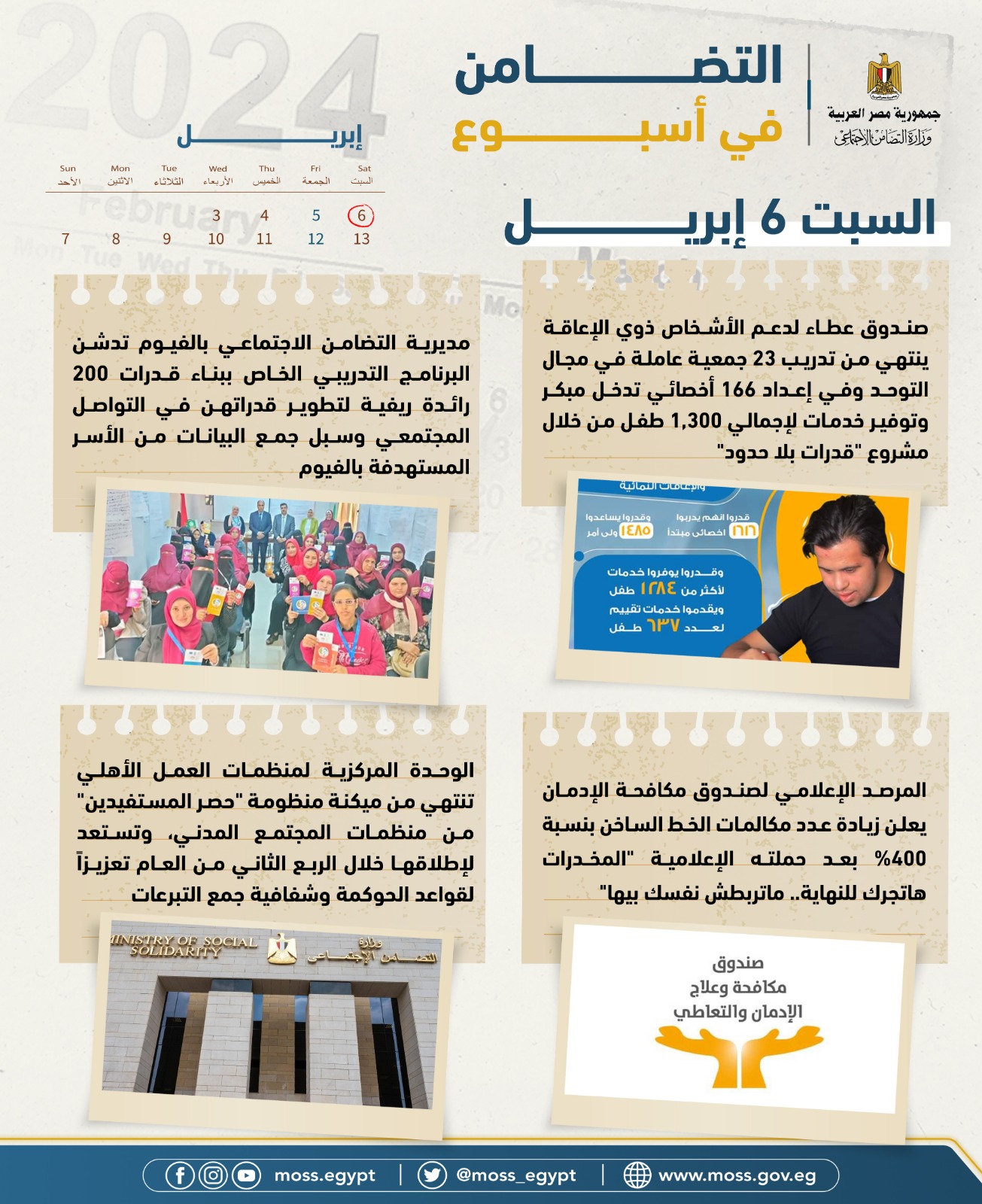 أصدرت وزارة التضامن الاجتماعي تقريرها الأسبوعي بالإنفوجراف والفيديو، حيث تستعرض من خلاله الأنشطة والأحداث، التي قامت بها نيفين القباج وزيرة التضامن الاجتماعي، وكذلك قطاعات الوزارة المختلفة خلال الفترة من 5 إبريل إلى 11 إبريل 2024 ونستعرض أبرزها في التقرير التالي: