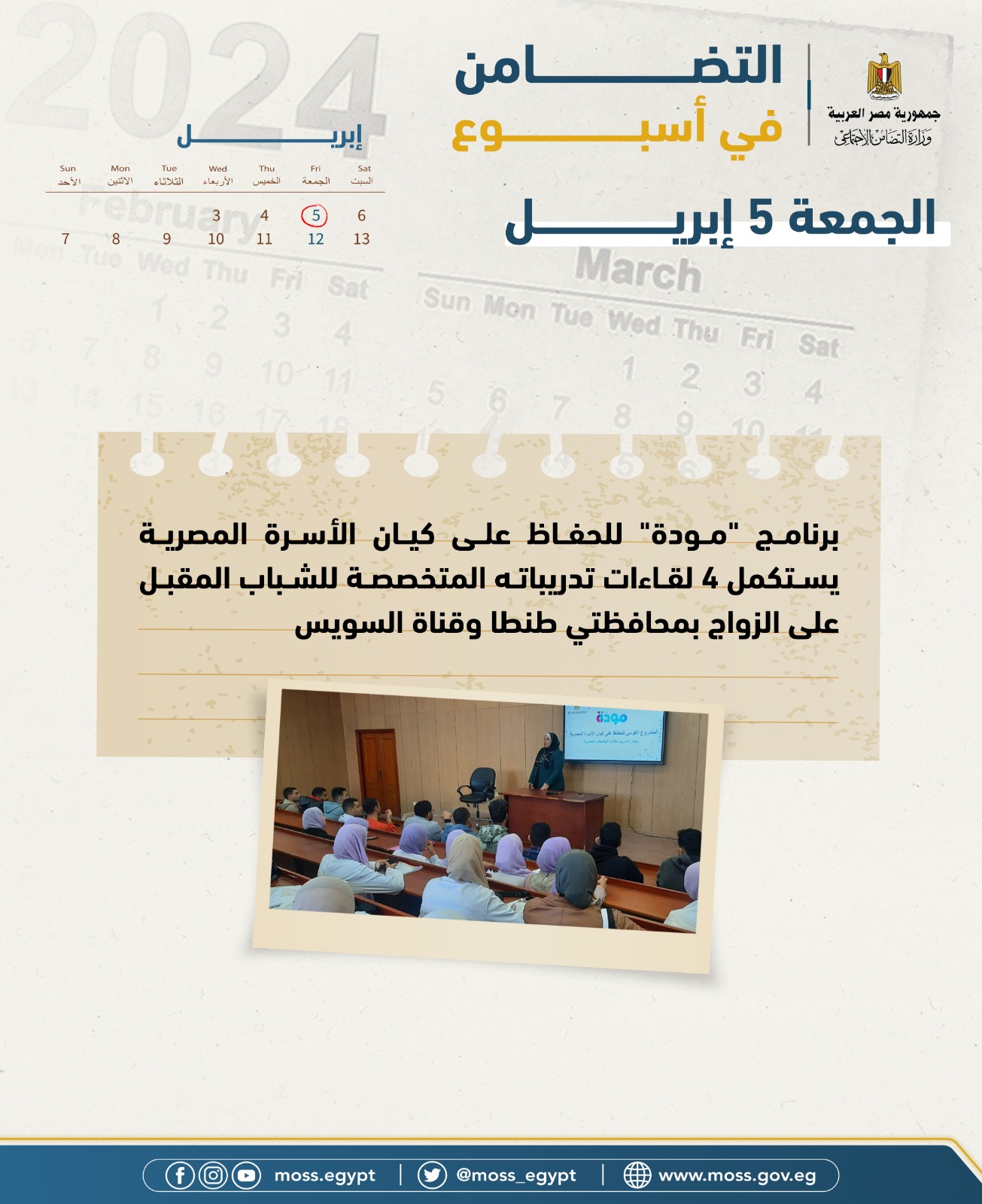 - برنامج "مودة" للحفاظ على كيان الأسرة المصرية يستكمل 4 لقاءات تدريباته المتخصصة للشباب المقبل على الزواج بمحافظتي طنطا وقناة السويس.