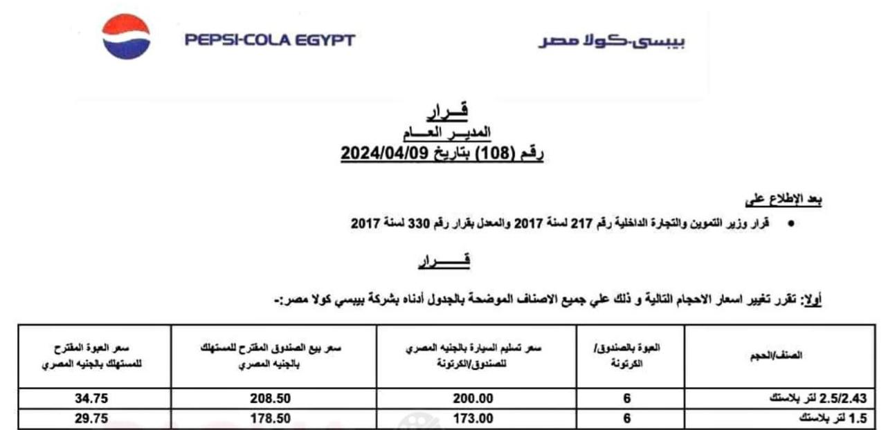كما قررت شركة كوكاكولا رفع الأسعار بزيادة تقدر بحوالي 7 جنيهات للتر الواحد خاصة للعبوات كبيرة الحجم 1.5 لتر، علي أن ييدأ التطبيق الفعلي للزيادة غدا السبت 13 إبريل 2024.