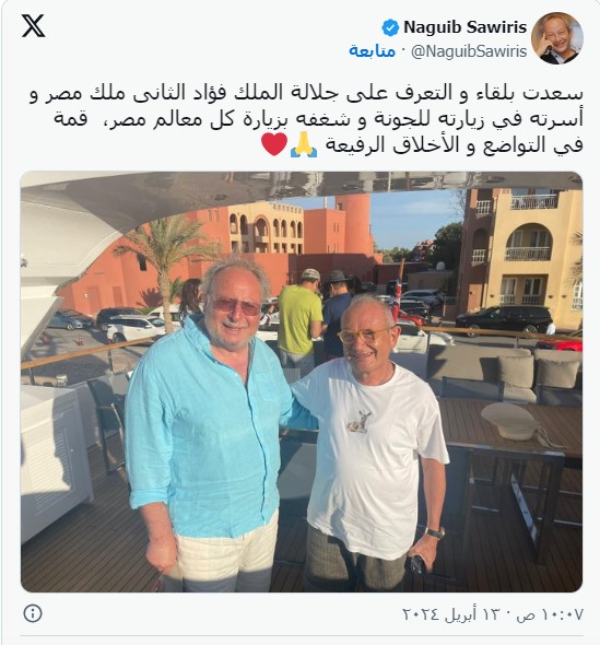 نشر الملياردير المصري نجيب ساويرس على حسابه في منصة "إكس" اليوم السبت صورة تجمعه بملك مصر السابق أحمد فؤاد الثاني نجل الملك فاروق.
