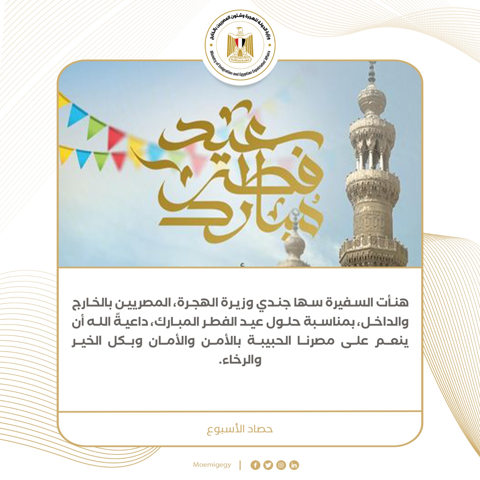 1- هنأت السفيرة سها جندي وزيرة الهجرة، المصريين بالخارج والداخل، بمناسبة حلول عيد الفطر المبارك، داعيةً الله أن ينعم على مصرنا الحبيبة بالأمن والأمان وبكل الخير والرخاء.