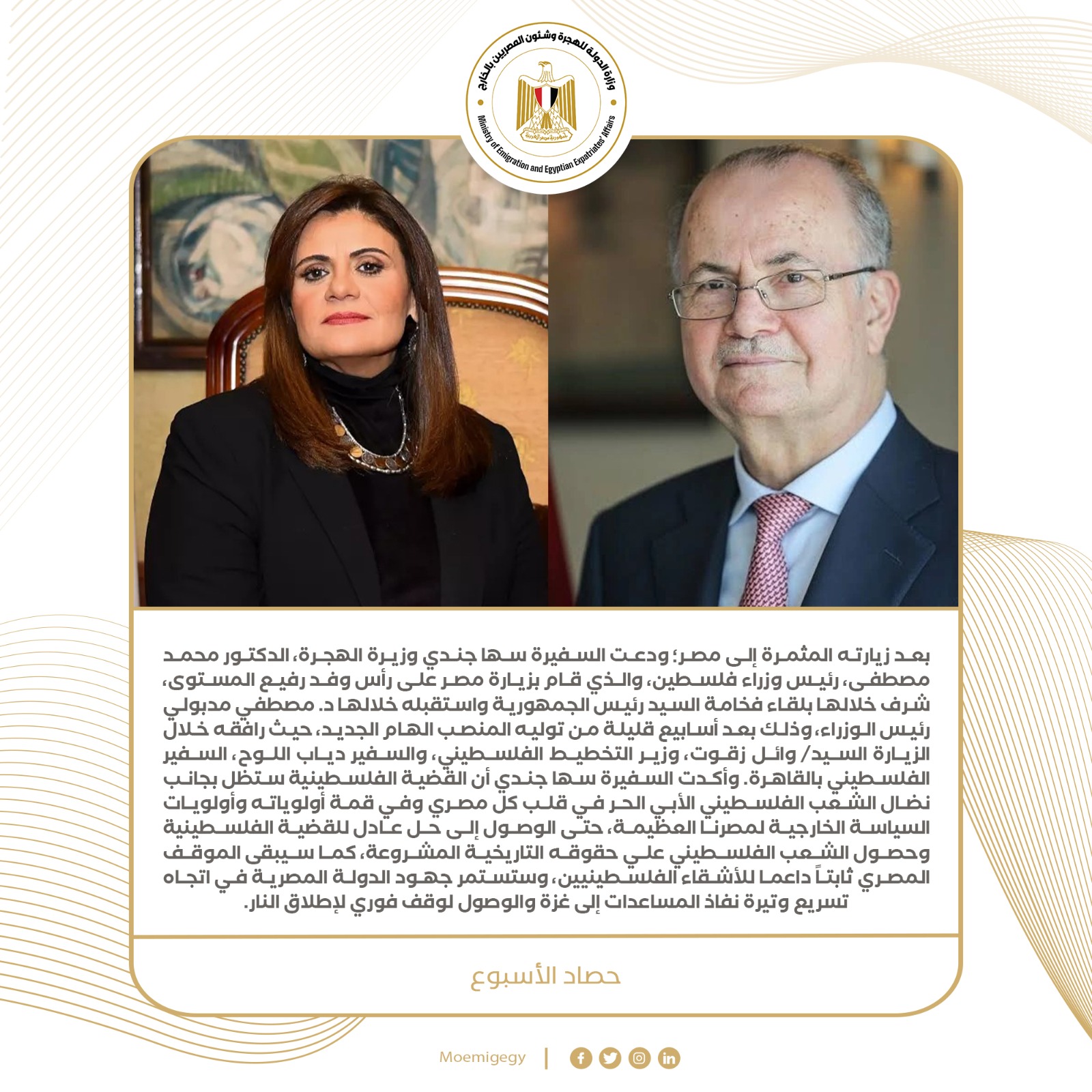 2- بعد زيارته المثمرة إلى مصر؛ ودعت السفيرة سها جندي وزيرة الهجرة، الدكتور محمد مصطفى، رئيس وزراء فلسطين، والذي قام بزيارة مصر على رأس وفد رفيع المستوى، شرف خلالها بلقاء فخامة السيد رئيس الجمهورية واستقبله خلالها د. مصطفي مدبولي رئيس الوزراء، وذلك بعد أسابيع قليلة من توليه المنصب الهام الجديد، حيث رافقه خلال الزيارة السيد/ وائل زقوت، وزير التخطيط الفلسطيني، والسفير دياب اللوح، السفير الفلسطيني بالقاهرة. وأكدت السفيرة سها جندي أن القضية الفلسطينية ستظل بجانب نضال الشعب الفلسطيني الأبي الحر في قلب كل مصري وفي قمة أولوياته وأولويات السياسة الخارجية لمصرنا العظيمة، حتى الوصول إلى حل عادل للقضية الفلسطينية وحصول الشعب الفلسطيني علي حقوقه التاريخية المشروعة، كما سيبقى الموقف المصري ثابتاً داعما للأشقاء الفلسطينيين، وستستمر جهود الدولة المصرية في اتجاه تسريع وتيرة نفاذ المساعدات إلى غزة والوصول لوقف فوري لإطلاق النار.