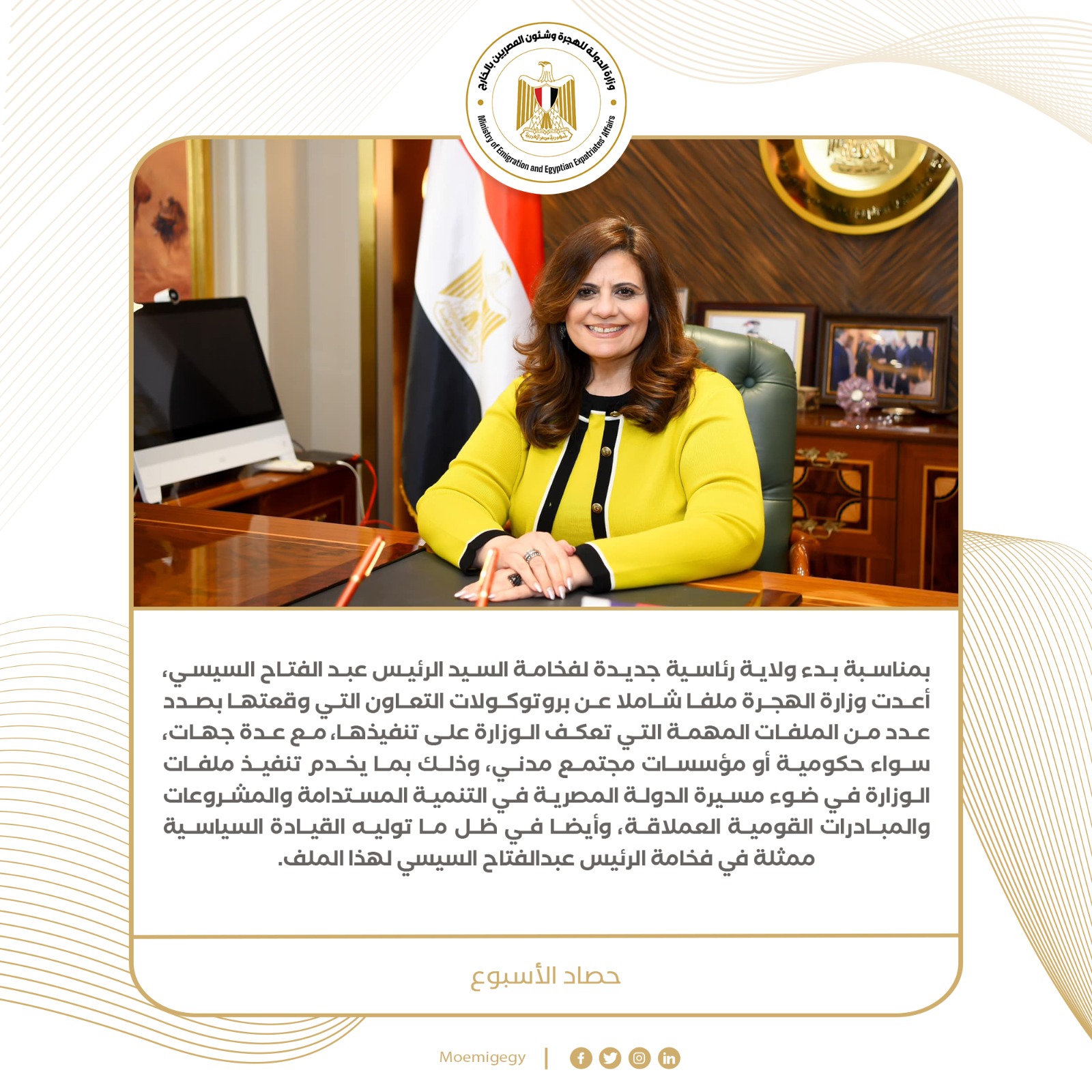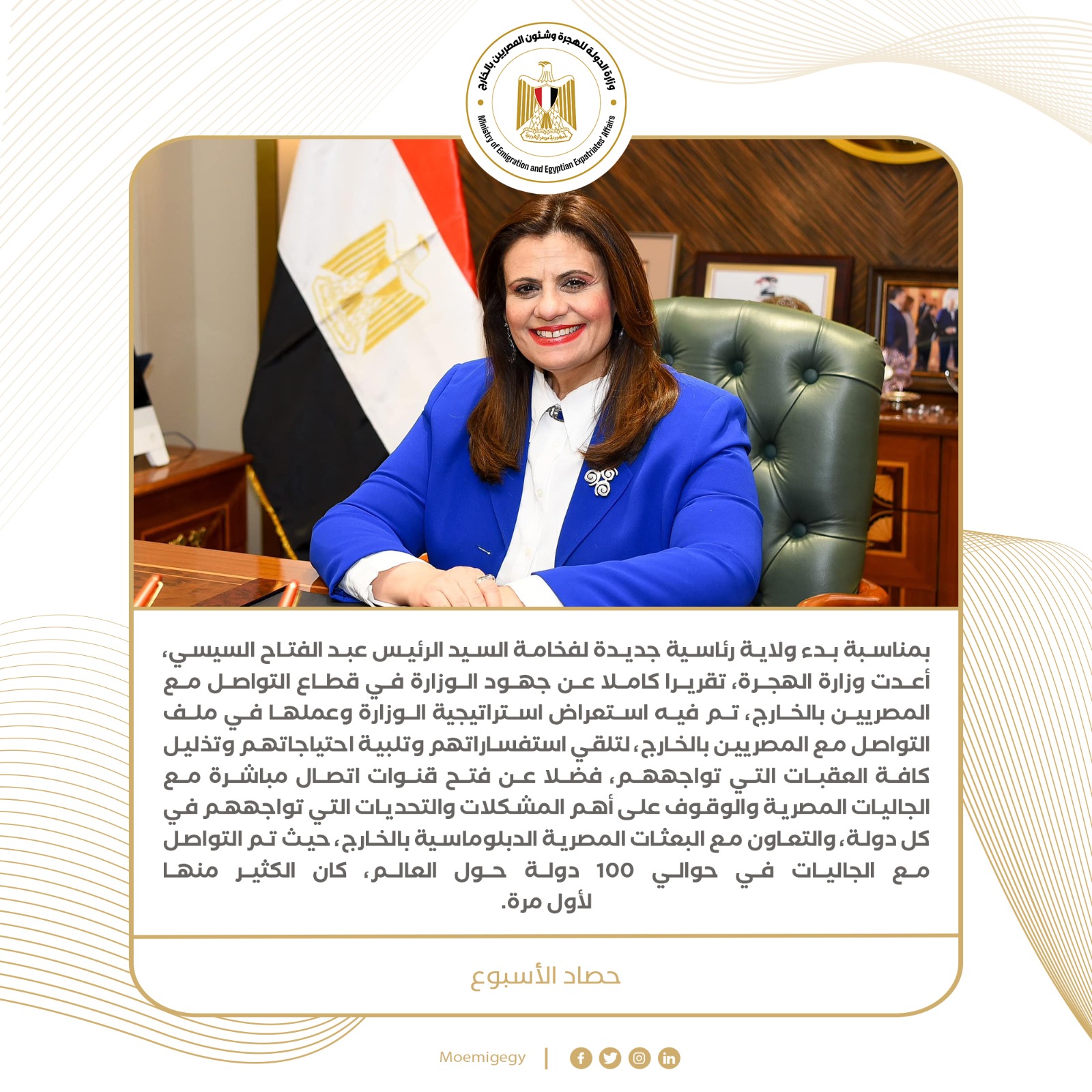 4 - بمناسبة بدء ولاية رئاسية جديدة لفخامة السيد الرئيس عبد الفتاح السيسي، أعدت وزارة الهجرة، تقريرا كاملا عن جهود الوزارة في قطاع التواصل مع المصريين بالخارج، تم فيه استعراض استراتيجية الوزارة وعملها في ملف التواصل مع المصريين بالخارج، لتلقي استفساراتهم وتلبية احتياجاتهم وتذليل كافة العقبات التي تواجههم، فضلا عن فتح قنوات اتصال مباشرة مع الجاليات المصرية والوقوف على أهم المشكلات والتحديات التي تواجههم في كل دولة، والتعاون مع البعثات المصرية الدبلوماسية بالخارج، حيث تم التواصل مع الجاليات في حوالي ١٠٠ دولة حول العالم، كان الكثير منها لأول مرة.