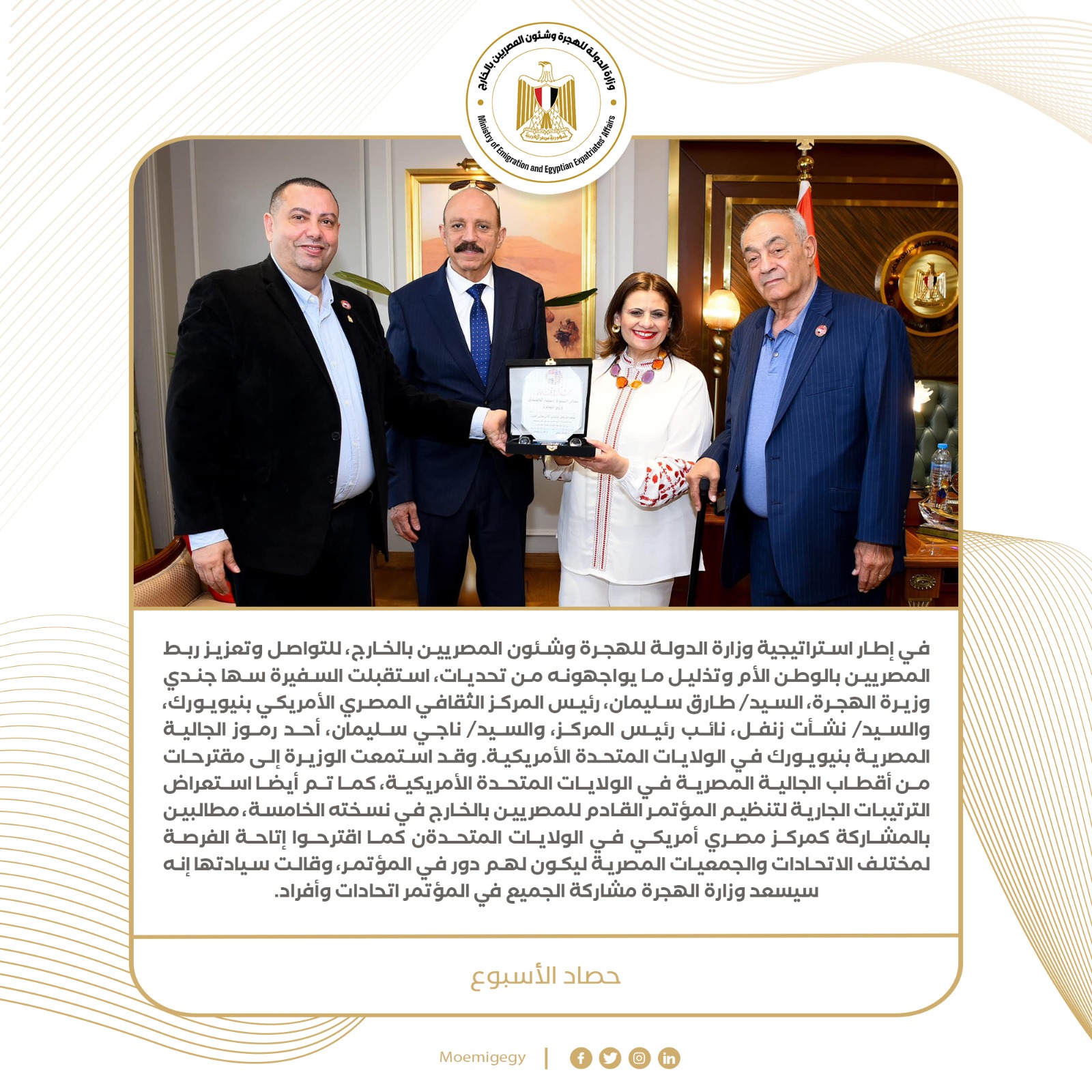 5- في إطار استراتيجية وزارة الدولة للهجرة وشئون المصريين بالخارج، للتواصل وتعزيز ربط المصريين بالوطن الأم وتذليل ما يواجهونه من تحديات، استقبلت السفيرة سها جندي وزيرة الهجرة، السيد/ طارق سليمان، رئيس المركز الثقافي المصري الأمريكي بنيويورك، والسيد/ نشأت زنفل، نائب رئيس المركز، والسيد/ ناجي سليمان، أحد رموز الجالية المصرية بنيويورك في الولايات المتحدة الأمريكية. وقد استمعت الوزيرة إلى مقترحات من أقطاب الجالية المصرية في الولايات المتحدة الأمريكية، كما تم أيضا استعراض الترتيبات الجارية لتنظيم المؤتمر القادم للمصريين بالخارج في نسخته الخامسة، مطالبين بالمشاركة كمركز مصري أمريكي في الولايات المتحدةن كما اقترحوا إتاحة الفرصة لمختلف الاتحادات والجمعيات المصرية ليكون لهم دور في المؤتمر، وقالت سيادتها إنه سيسعد وزارة الهجرة مشاركة الجميع في المؤتمر اتحادات وأفراد.