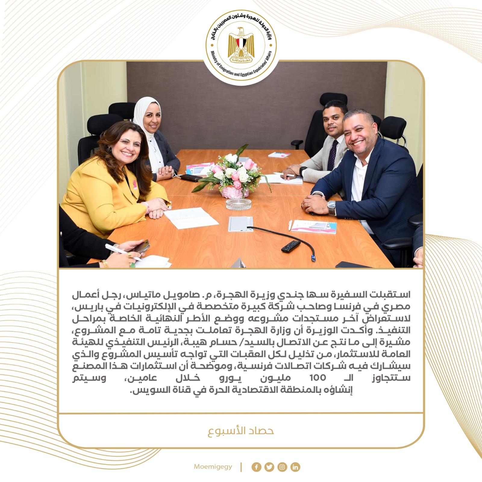 6- استقبلت السفيرة سها جندي وزيرة الهجرة، م. صامويل ماتياس، رجل أعمال مصري في فرنسا وصاحب شركة كبيرة متخصصة في الإلكترونيات في باريس، لاستعراض آخر مستجدات مشروعه ووضع الأطر النهائية الخاصة بمراحل التنفيذ. وأكدت الوزيرة أن وزارة الهجرة تعاملت بجدية تامة مع المشروع، مشيرة إلى ما نتج عن الاتصال بالسيد/ حسام هيبة، الرئيس التنفيذي للهيئة العامة للاستثمار، من تذليل لكل العقبات التي تواجه تأسيس المشروع والذي سيشارك فيه شركات اتصالات فرنسية، وموضحة أن استثمارات هذا المصنع ستتجاوز الـ 100 مليون يورو خلال عامين، وسيتم إنشاؤه بالمنطقة الاقتصادية الحرة في قناة السويس.