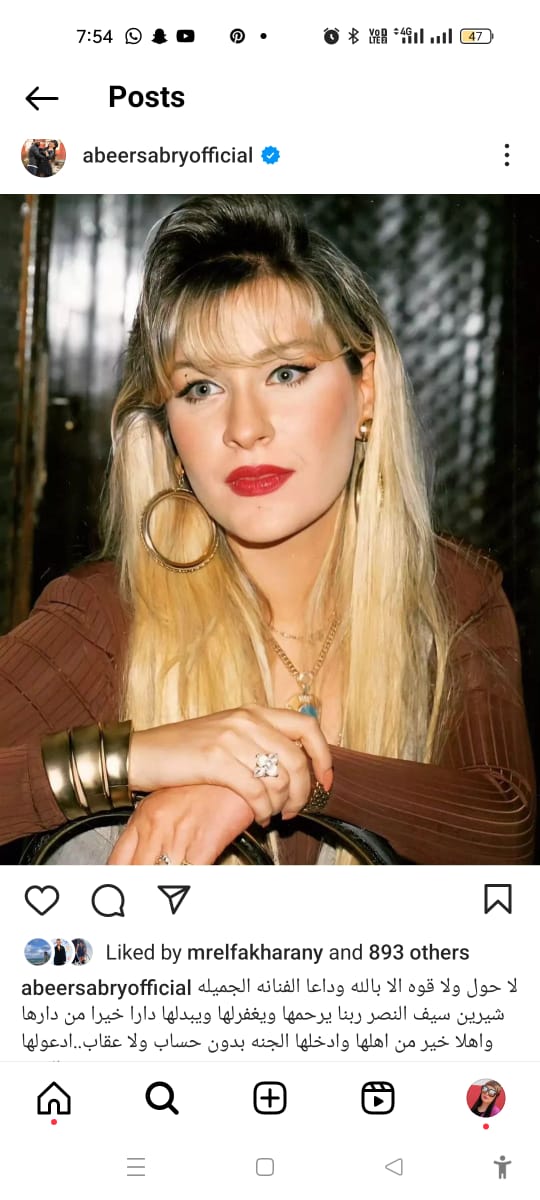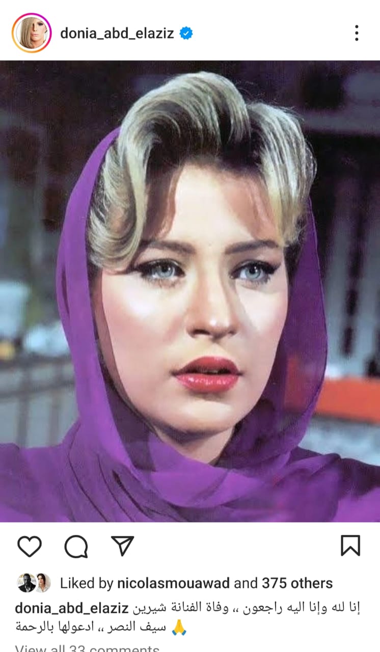 كما نشرت الفنانة دنيا عبد العزيز منشور لها موقع إنستجرام قالت فيه "إنا لله وإنا اليه راجعون ،، وفاة الفنانة شيرين سيف النصر،، ادعولها بالرحمة".