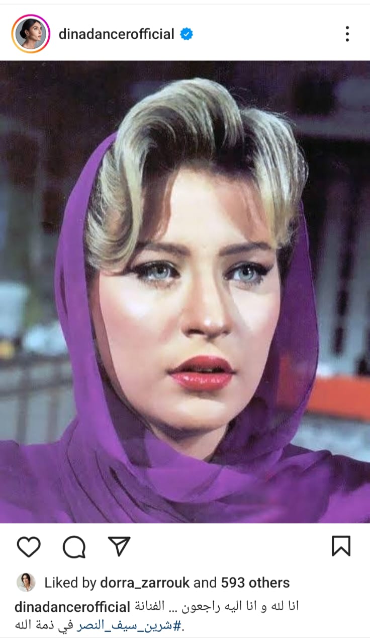 ونعت الراقصة دينا عبر حسابها الرسمي على موقع انستجرام الفنانة شيرين سيف النصر قائلة" انا لله وانا إليه راجعون..الفنانة شيرين سيف النصر في ذمة الله.