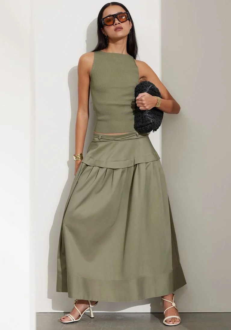 كما يبدو التانك توب الكاكي رائعا في إطار الإطلالة أحادية اللون (المونوكروم). ولهذا الغرض يمكن تنسيقه مع تنورة بنفس اللون، على أن تكتمل أناقة الإطلالة بصندل رقيق.