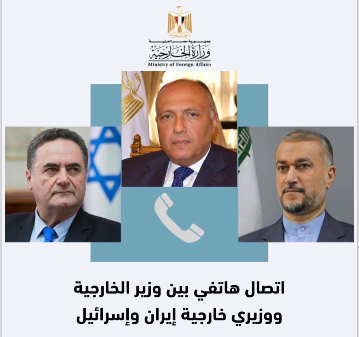 صرَّح السفير أحمد أبو زيد، المتحدث الرسمي ومدير إدارة الدبلوماسية العامة بوزارة الخارجية، بأن السفير سامح شكري وزير الخارجية أجرى اتصالين هاتفيين يوم الأحد 14 أبريل الجاري مع الدكتور حسين أمير عبد اللهيان، وزير خارجية إيران، ويسرائيل كاتس، وزير خارجية إسرائيل، اتصالاً بما شهدته الساعات الأخيرة من تصعيد عسكرى خطير نتيجة إطلاق مسيرات إيرانية هجومية ضد أهداف إسرائيلية.