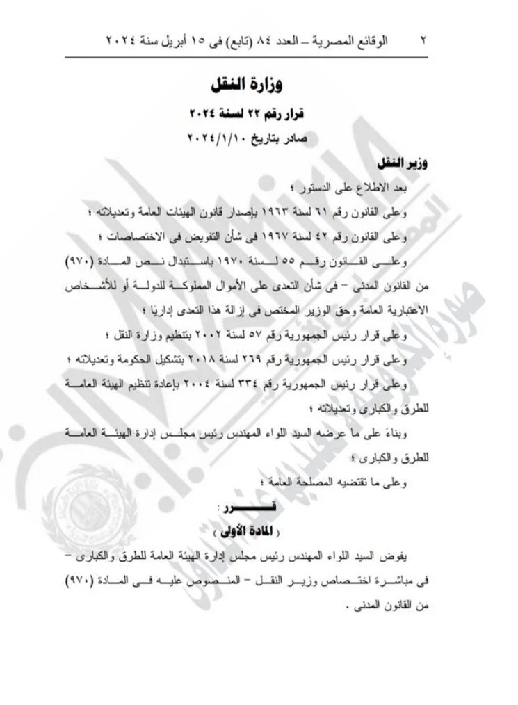 وتضمن القرار الذى نشر فى الجريدة الرسمية وأصدره وزير النقل كامل الوزير بتفويض رئيس هيئة الطرق والكباري لمباشرة اختصاصات وزير النقل المنصوص عليها في المادة 970 للقانون المدني.