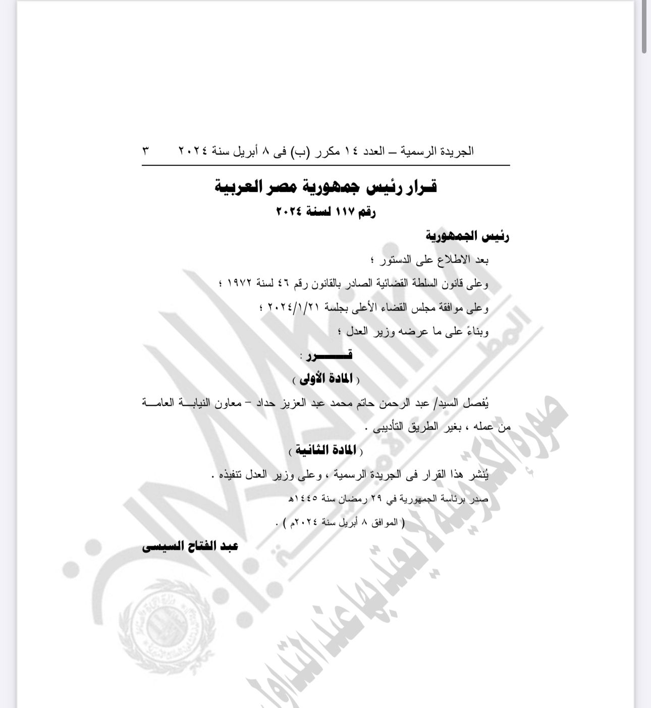 أصدر الرئيس عبد الفتاح السيسي قرار بفصل عبد الرحمن حاتم محمد عبد العزيز حداد، معاون النيابة العامة ، من عمله بغير الطريق التأديبي.