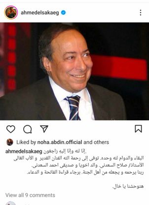 وكتب أحمد السقا عبر حسابه الشخصي على تطبيق إنستجرام قائلا:"إنا لله وإنا إليه راجعون، البقاء والدوام لله وحده، توفي إلى رحمة الله الفنان القدير والأب الغالي الأستاذ صلاح السعدني، والد أخويا وصديقي أحمد السعدني، ربنا يرحمه ويجعله من أهل الجنة، برجاء قراءة الفاتحة والدعاء.. هتوحشنا يا خال".