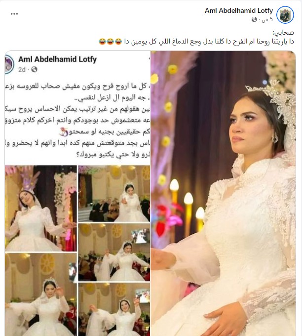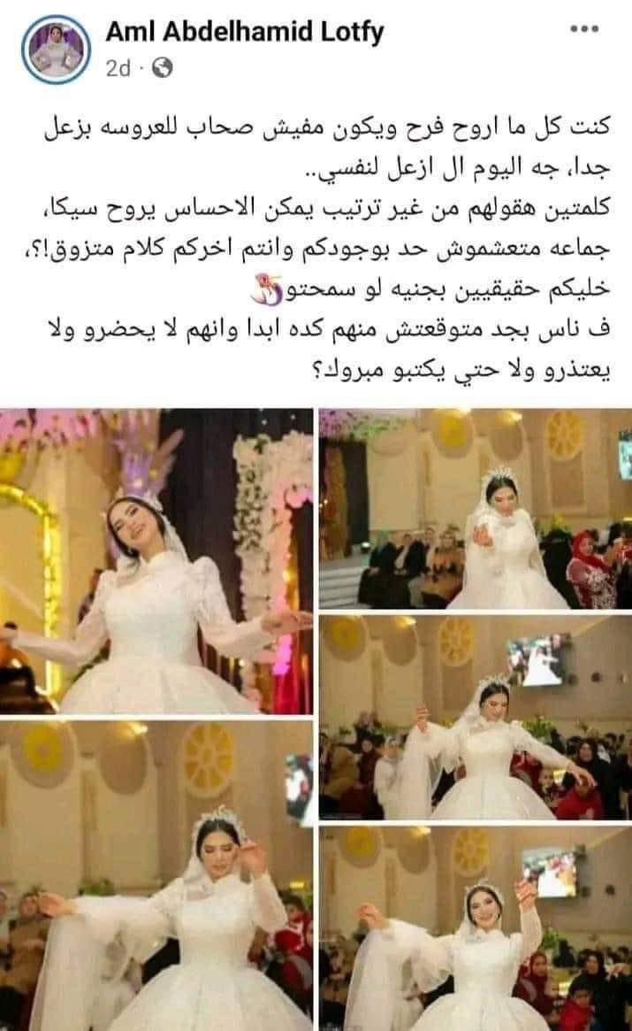 تصدرت مواقع التواصل الاجتماعى منشور لعروسة تدعى أمل عبد الحميد لطفى ، من المنصورة وهى تشكو تخلى أصحابها عنها فى ليلة العمر ويوم زفافها وظهرت وحيدة فى الفرح ، ونشرت كلمات تعبر خلالها عن حزنها لتخلى أصدقائها عنها.