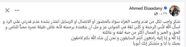 وقال عبر صفحته على موقع التواصل الاجتماعى " شكر واجب لكل من قدم واجب العزاء سواء بالحضور او الاتصال او الرسايل اعتذر بشده عدم قدرتي علي الرد و اسأل الله لأبي الرحمة و كلي ثقة في المولي عز و جل ان يتغمده برحمته لأنه عاش طيلة عمره محباً للناس و الحق و الخير و الجمال اكثر من حبه لفنه و عائلته إنا لله و إنا إليه راجعون أنتم السابقون و نحن إن شاء الله بكم لاحقون بحبك يا ابا و متشكر إنك أبويا