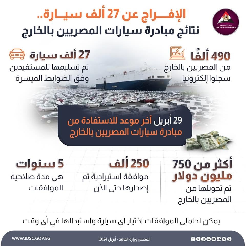أعلن الدكتور محمد معيط، وزير المالية، أن آخر موعد للتسجيل في مبادرة استيراد سيارات المصريين بالخارج يوم 29 أبريل الجاري.