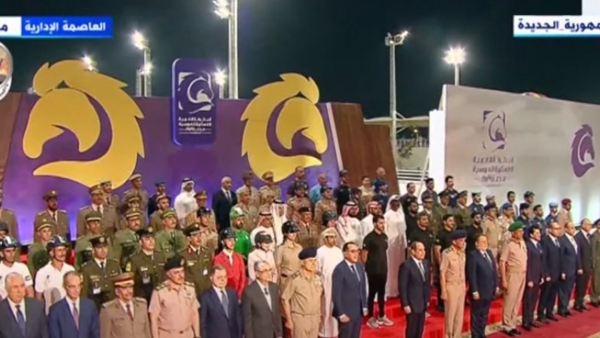 الرئيس السيسي يتوسط صورة تذكارية مع المنتخبات المشاركة في البطولة العربية العسكرية للفروسية