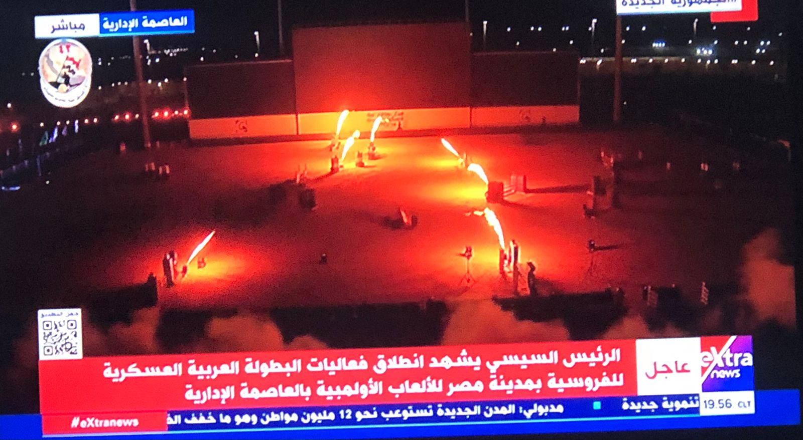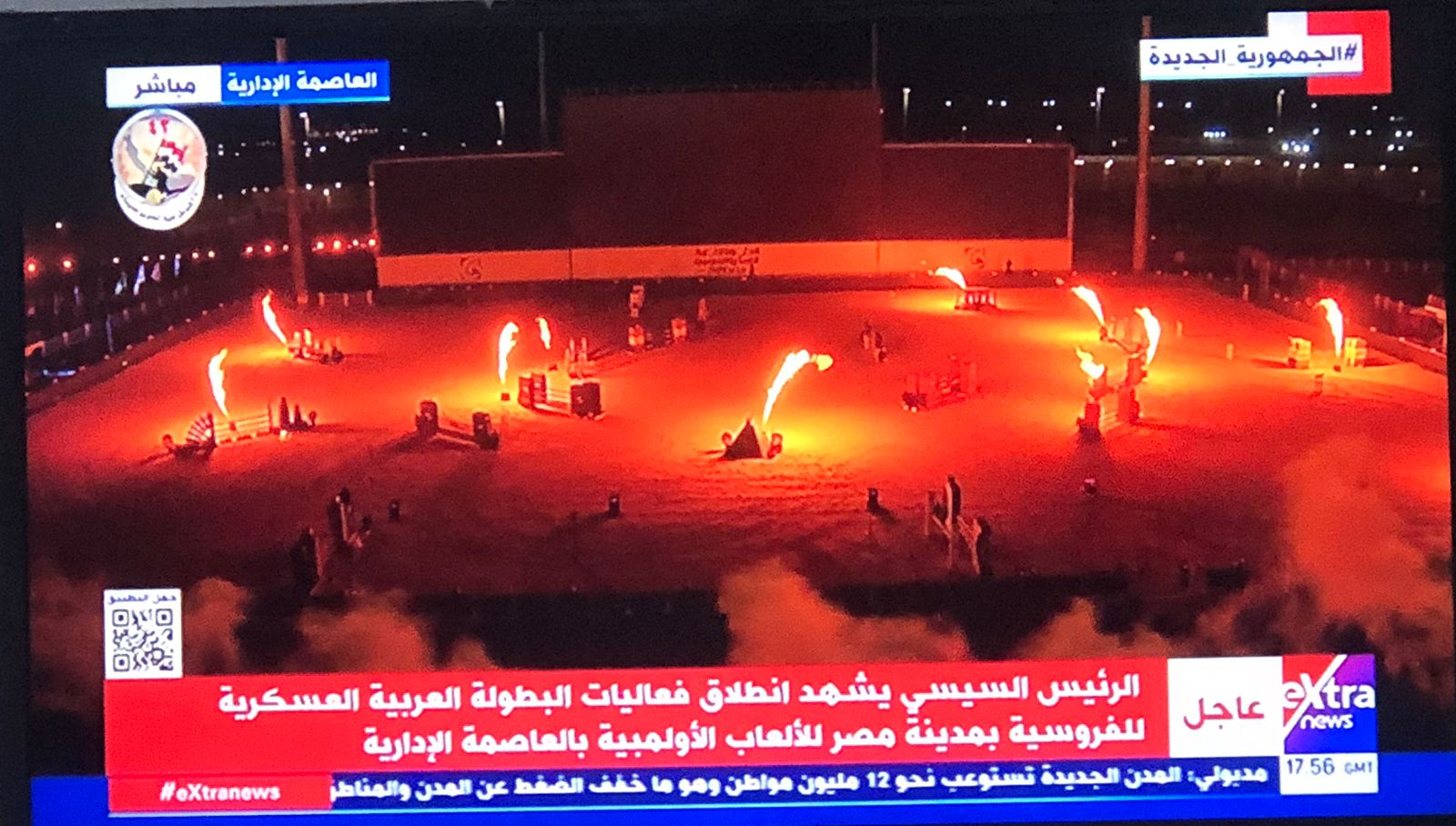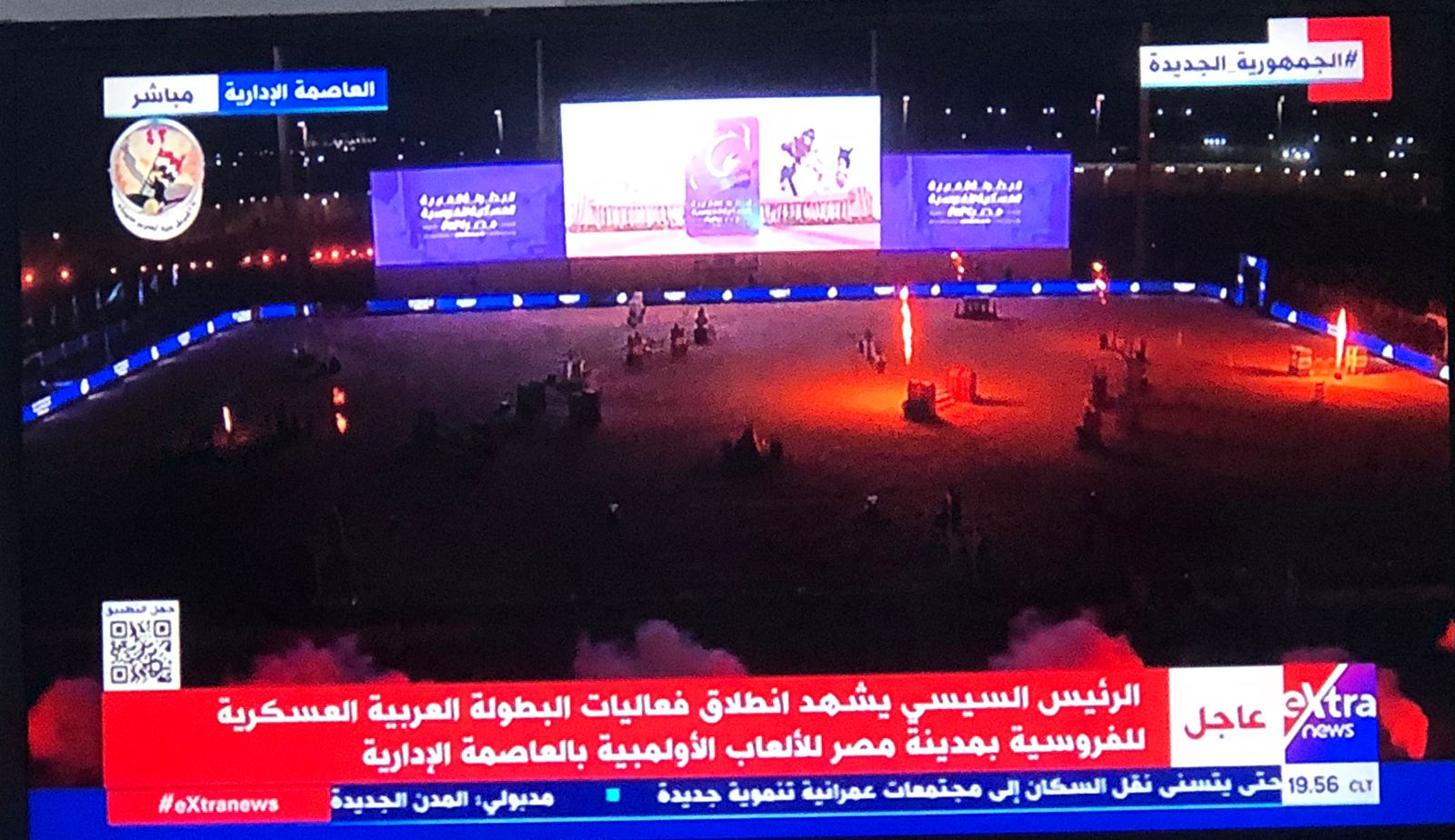 أذاعت قناة إكسترا نيوز" فعاليات انطلاق فعاليات افتتاح البطولة العربية العسكرية للفروسية بمدينة مصر للألعاب الأولمبية بالعاصمة الإدارية بحضور الرئيس السيسي، والتي بدأت الفعاليات بفيلم وثائقي، عن نادي الفروسية، يوضح أهمية الفروسية والركوب الخيل، ومدى اهتمام مصر بها عربيا وإقليميا