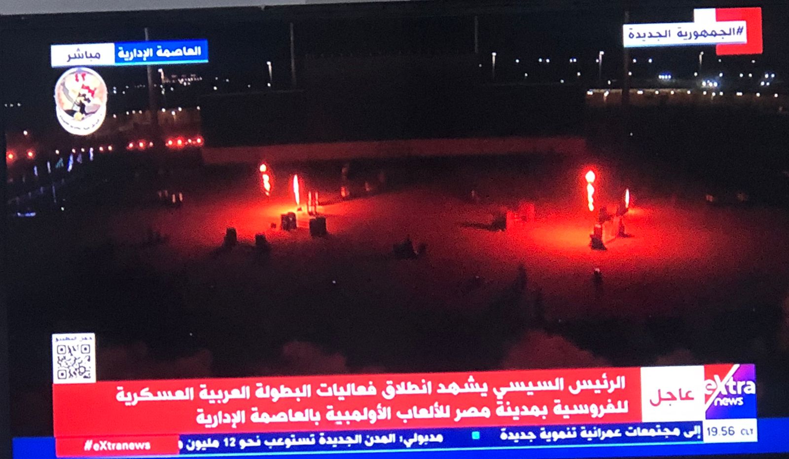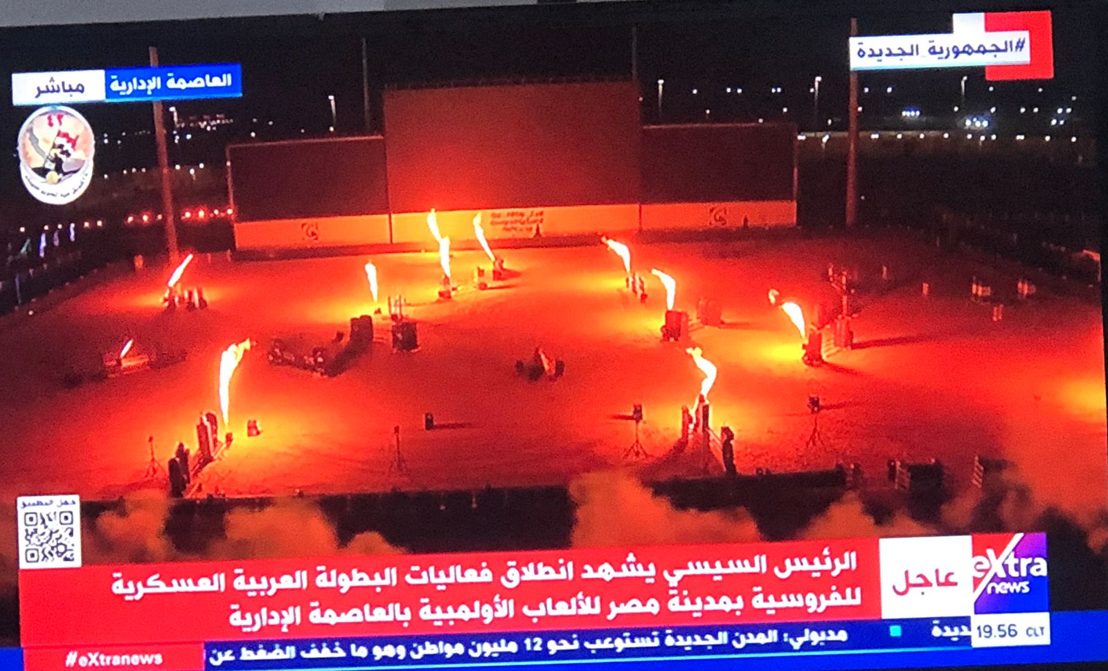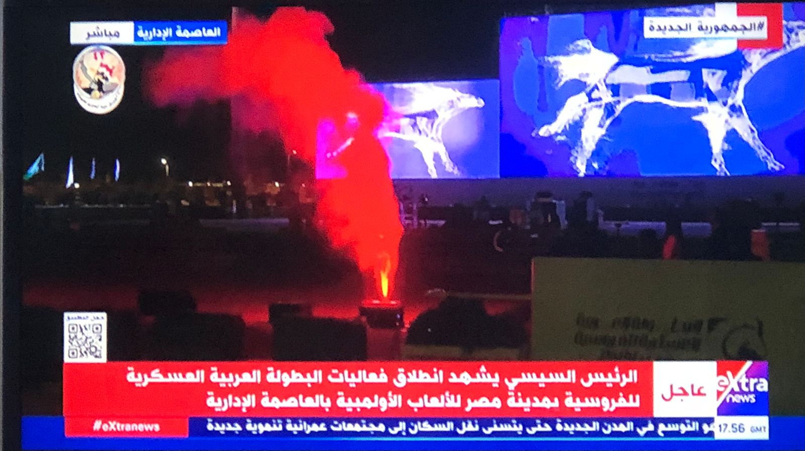أذاعت قناة إكسترا نيوز" فعاليات انطلاق فعاليات افتتاح البطولة العربية العسكرية للفروسية بمدينة مصر للألعاب الأولمبية بالعاصمة الإدارية بحضور الرئيس السيسي، والتي بدأت الفعاليات بفيلم وثائقي، عن نادي الفروسية، يوضح أهمية الفروسية والركوب الخيل، ومدى اهتمام مصر بها عربيا وإقليميا
