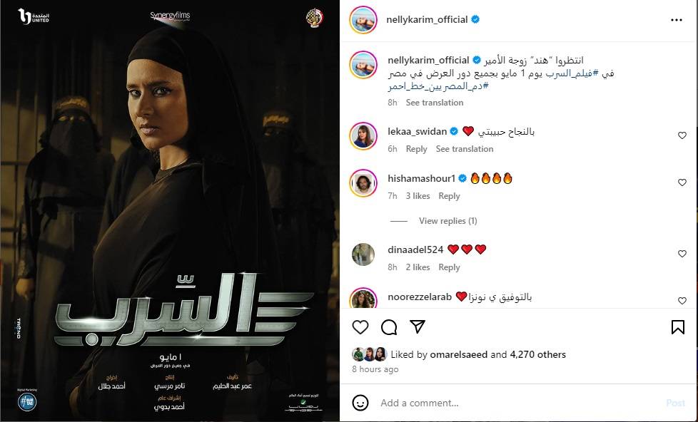 كشفت الفنانة نيللي كريم، عن الشخصية التي تقوم بتجسيدها في فيلم السرب، نشرت صورة لبوستر الفيلم على صفحتها الخاصة على موقع "إنستجرام"، ظهرت خلاله مرتديةً الزي الداعشي، وعلّقت عليه قائلةً: "انتظروا هند زوجة الأمير في فيلم "السرب" 1 مايو بكل دور العرض في مصر".