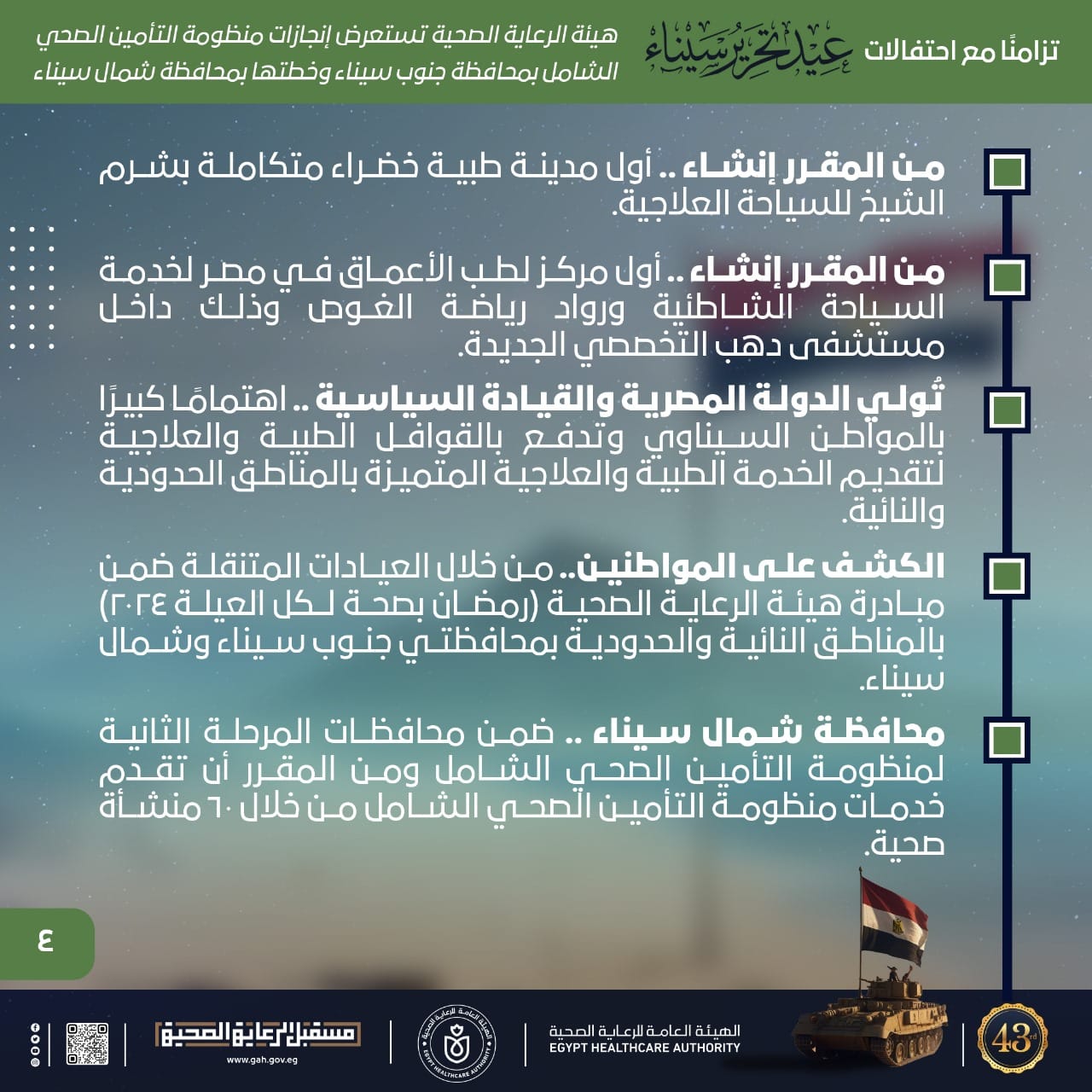وفيما يخص محافظة شمال سيناء، أشار رئيس هيئة الرعاية الصحية أن محافظة شمال سيناء ضمن محافظات المرحلة الثانية لمنظومة التأمين الصحي الشامل ومن المقرر أن تقدم خدمات منظومة التأمين الصحي الشامل من خلال 60 منشأة صحية، لافتًا إلى جهود الدولة المستمرة من خلال الدفع بالقوافل الطبية لتقديم الخدمة الطبية والعلاجية المتميزة لقاطني المناطق الحدودية والنائية، لافتًا أن مبادرة الهيئة (رمضان بصحة لكل العيلة) استهدفت خلال 2024 على وجه الخصوص المناطق النائية والحدودية بمحافظتي جنوب سيناء وشمال سيناء، مستعينة بالعيادات المتنقلة للكشف الطبي على المواطنين بعمق سيناء.