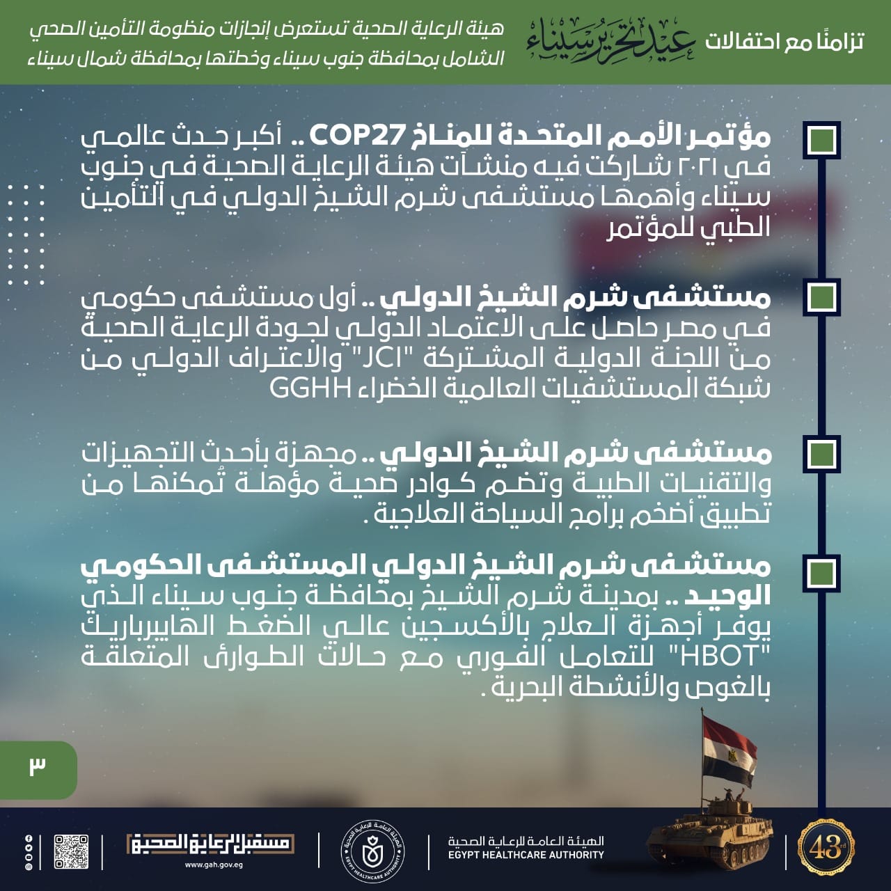 وأشار الدكتور أحمد السبكي، رئيس هيئة الرعاية الصحية، والمشرف العام على مشروعي التأمين الصحي الشامل وحياة كريمة بوزارة الصحة والسكان، أن الرئيس عبدالفتاح السيسي يُولي اهتمامًا كبيرًا بالمواطن السيناوي لافتًا إلى الطفرة الكبيرة التي شهدتها محافظات سيناء في الخدمات المقدمة للمواطنين، مؤكدًا أن جهود تنمية سيناء تؤكد وضعها في مقدمة خريطة التنمية الشاملة والمُستدامة التي تستهدف الدولة والقيادة السياسة تحقيقها في كافة ربوع الوطن وفقًا لرؤية مصر(2030) خاصة في شبه جزيرة سيناء لما تمثله من أهمية خاصة للأمن القومي المصري.