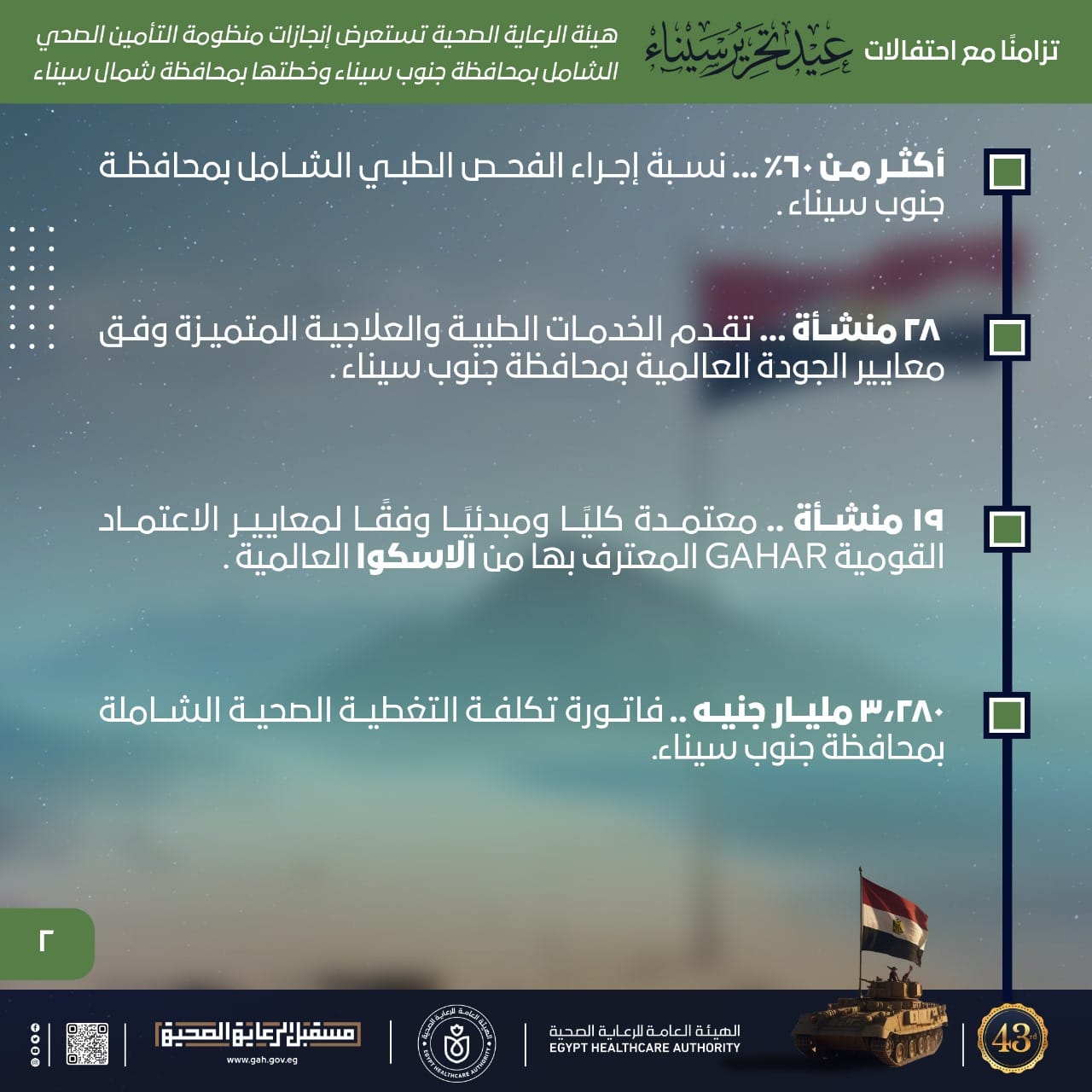 استعرضت الهيئة العامة للرعاية الصحية، من خلال «انفوجراف» إنجازاتها بمحافظة جنوب سيناء، وذلك منذ إطلاق الرئيس عبد الفتاح السيسي رئيس الجمهورية منظومة التأمين الصحي الشامل بالمحافظة عبر تقنية الفيديو كونفرانس، ويأتي ذلك تزامنًا مع احتفالات الدولة المصرية بعيد تحرير سيناء.