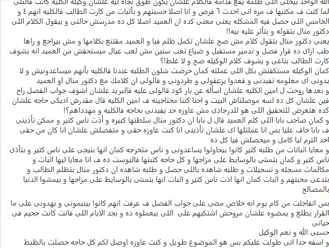 وجاء نص الإستغاثة التي نشرتها الطالبة علي صفحتها عبر الفيس بوك :"طيب يا جماعه معلش البوست ممكن يبقي طويل شويه بس اتمنى تقرأوه للآخر علشان تشوفوا ان ممكن السلطات توصل لأيه و ان عادى يبقى فيه اهمال و ظلم و تعسف بالشكل ده