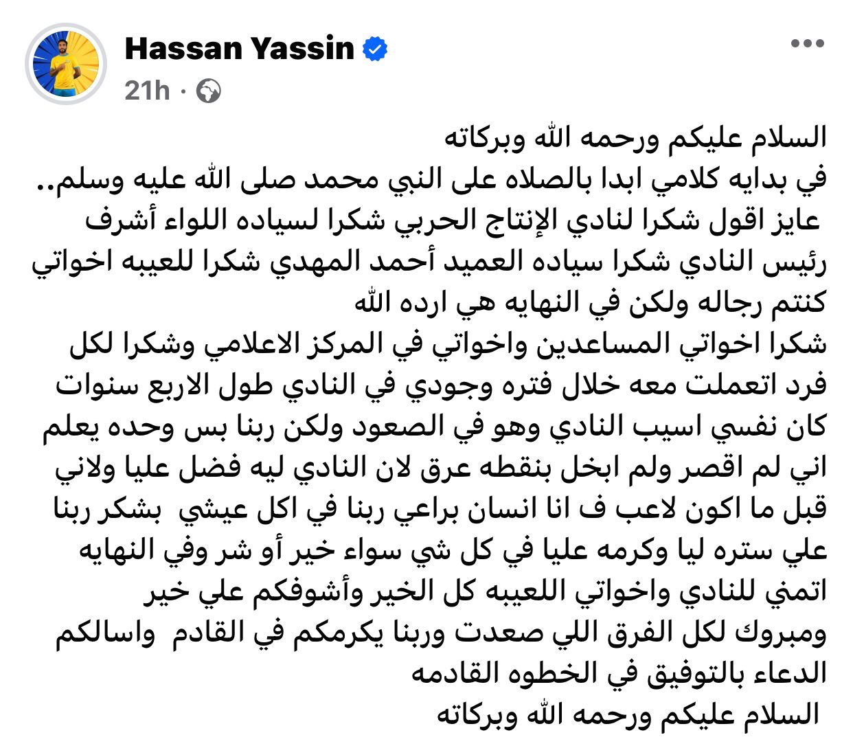 ونشر اللاعب عبر حسابه الشخصي بموقع التواصل الإجتماعي"فيسبوك" :السلام عليكم ورحمه الله وبركاته ،في بدايه كلامي ابدا بالصلاه على النبي محمد صلى الله عليه وسلم.