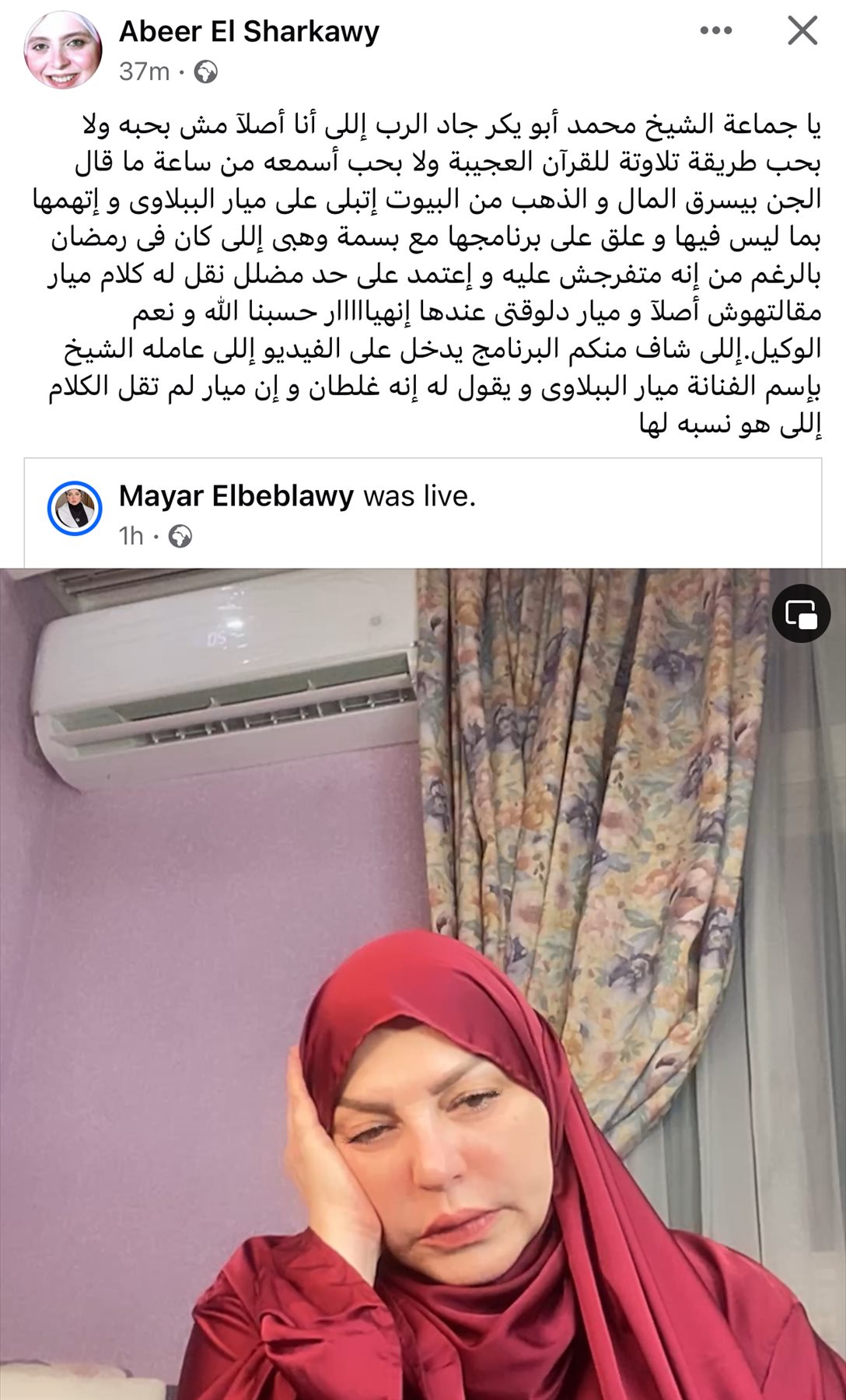 علقت الفنانة ميار الببلاوى على اتهام داعية لها بإنها “تتزوج الرجال لمدة يومين” ، وقالت منهارة" لقيت شيخ فاضل اللى أنا بحبه فى الله خاض فى عرضى وشرفى .. هو شيخ جليل وكلنا بنحبه بس من غير ما يتبين خاض فى عرضى"، متابعه" قالى انتى جيالى علشان أنا حطيتك على المرجيحة أصل أنا جيت عليكى جامد على الصفحة بتاعتى .. وقال عليا إن أنا زانية".