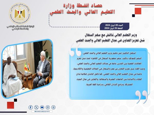 3) استقبل الدكتور أيمن عاشور وزير التعليم العالي والبحث العلمي، السفير كيموكو دياكيت، سفير جمهورية السنغال في القاهرة؛ لبحث سُبل تعزيز العلاقات العلمية بين البلدين، خاصة في مجالات التعليم العالي والبحث العلمي، وبحث اللقاء سبل تعزيز التعاون بين مصر والسنغال في المجالات التعليمية والأكاديمية، خاصة في مجال التعليم العالي والبحث العلمي. كما ناقش الجانبان إمكانية تبادل الطلاب والأساتذة بين الجامعات المصرية والسنغالية، والتعاون في مجال البحوث المشتركة، وبرامج التبادل الثقافي، ودراسة اللغة العربية.