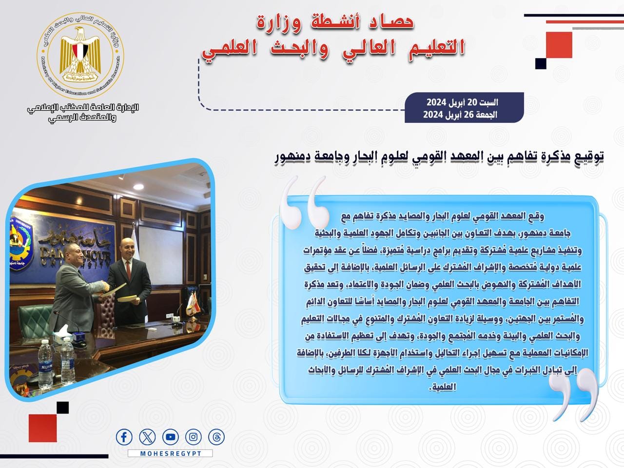 أصدرت الإدارة العامة للمكتب الإعلامي والمتحدث الرسمي لوزارة التعليم العالي والبحث العلمي تقريراً حول أداء أنشطة الوزارة خلال أسبوع في الفترة من 20 أبريل وحتى 26 أبريل وكان على النحو الآتي: