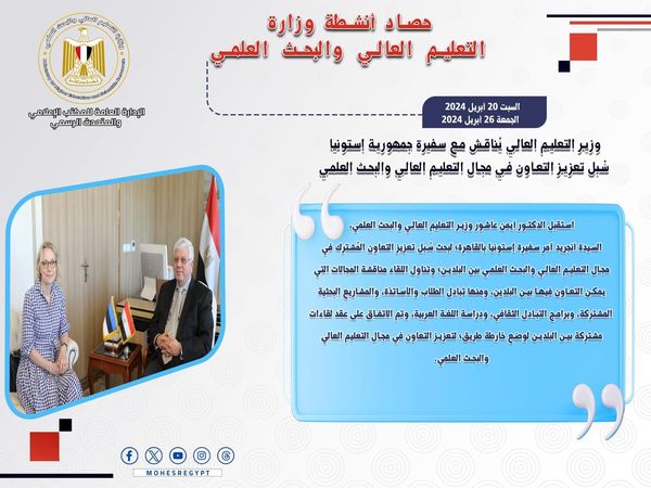 1) استقبل الدكتور أيمن عاشور وزير التعليم العالي والبحث العلمي، السيدة أنجريد آمر سفيرة إستونيا بالقاهرة؛ لبحث سُبل تعزيز التعاون المُشترك في مجال التعليم العالي والبحث العلمي بين البلدين؛ وتناول اللقاء مناقشة المجالات التي يمكن التعاون فيها بين البلدين، ومنها تبادل الطلاب والأساتذة، والمشاريع البحثية المشتركة، وبرامج التبادل الثقافي، ودراسة اللغة العربية، وتم الاتفاق على عقد لقاءات مشتركة بين البلدين لوضع خارطة طريق؛ لتعزيز التعاون في مجال التعليم العالي والبحث العلمي.