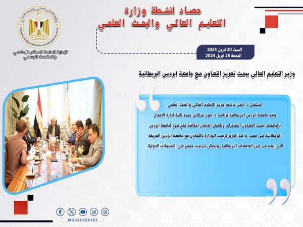 2) استقبل د. أيمن عاشور وزير التعليم العالي والبحث العلمي وفد جامعة أبردين البريطانية برئاسة د. جون سكاتن عميد كلية إدارة الأعمال بالجامعة، لبحث التعاون المشترك، وناقش الجانبان إمكانية فتح فرع لجامعة أبردين البريطانية فى مصر، وأكد الوزير ترحيب الوزارة بالتعاون مع جامعة أبردين العريقة التى تعد من أبرز الجامعات البريطانية، وتحظى بترتيب متميز فى التصنيفات الدولية.