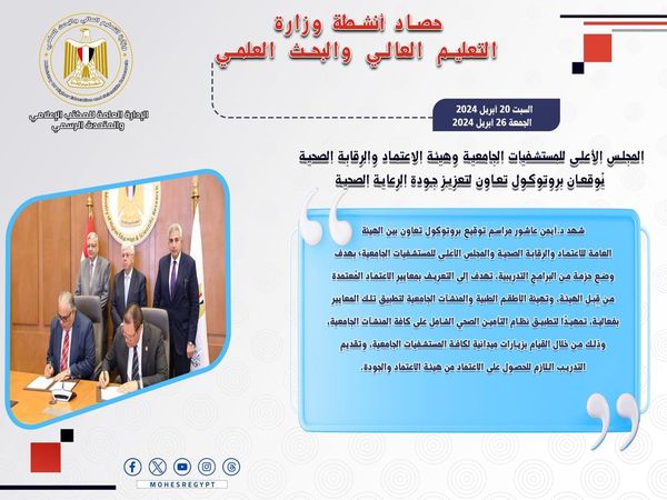 6) شهد د.أيمن عاشور مراسم توقيع بروتوكول تعاون بين الهيئة العامة للاعتماد والرقابة الصحية والمجلس الأعلى للمستشفيات الجامعية؛ بهدف وضع حزمة من البرامج التدريبية، تهدف إلى التعريف بمعايير الاعتماد المُعتمدة من قِبل الهيئة، وتهيئة الأطقم الطبية والمنشآت الجامعية لتطبيق تلك المعايير بفعالية، تمهيدًا لتطبيق نظام التأمين الصحي الشامل على كافة المنشآت الجامعية، وذلك من خلال القيام بزيارات ميدانية لكافة المستشفيات الجامعية، وتقديم التدريب اللازم للحصول على الاعتماد من هيئة الاعتماد والجودة.