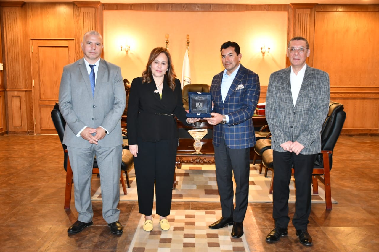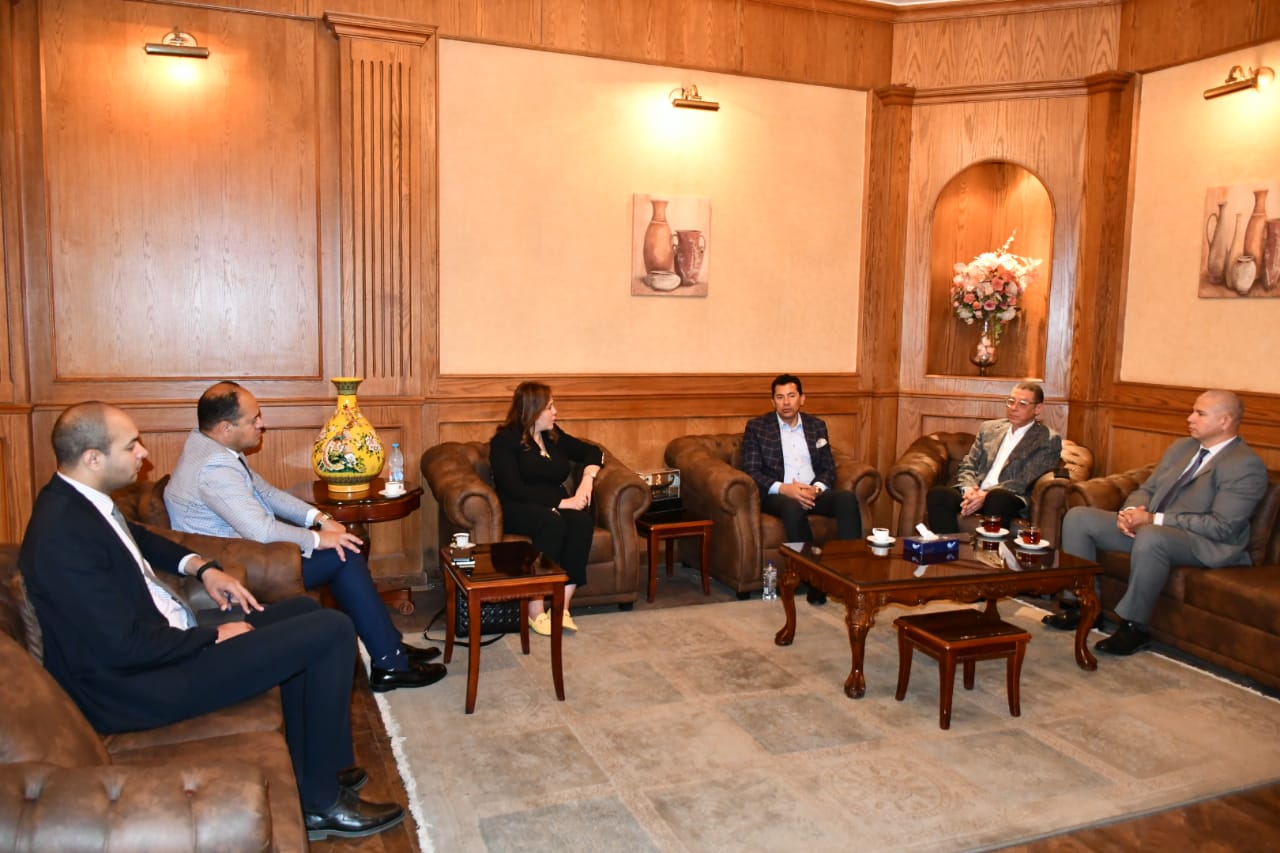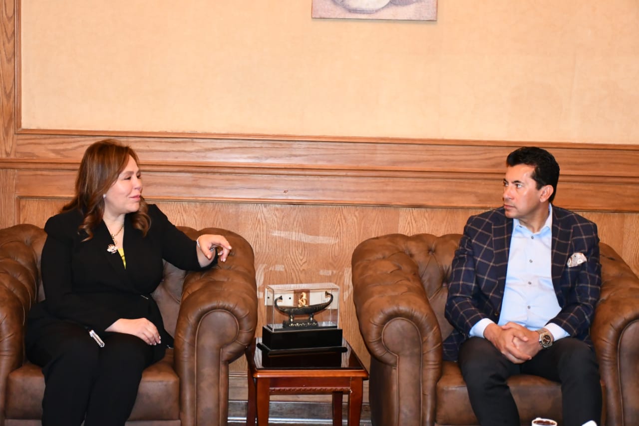 التقي اليوم الدكتور أشرف صبحي وزير الشباب والرياضة بالمغربية السيدة بشري حجيج رئيس الاتحاد الإفريقي للكرة الطائرة وبحضور المهندس ياسر قمر رئيس الاتحاد المصري للكرة الطائرة .