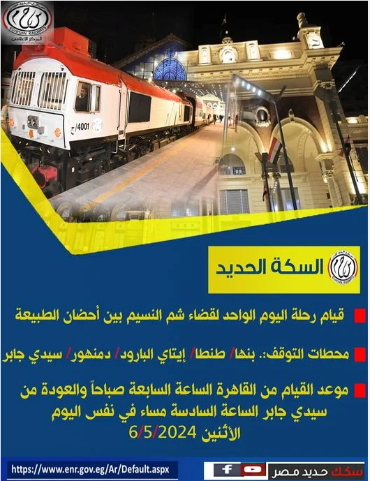 أعلنت الهيئة القومية لسكك حديد مصر، قيام رحلة اليوم الواحد، لقضاء شم النسيم بين أحضان الطبيعة في محافظة الإسكندرية.