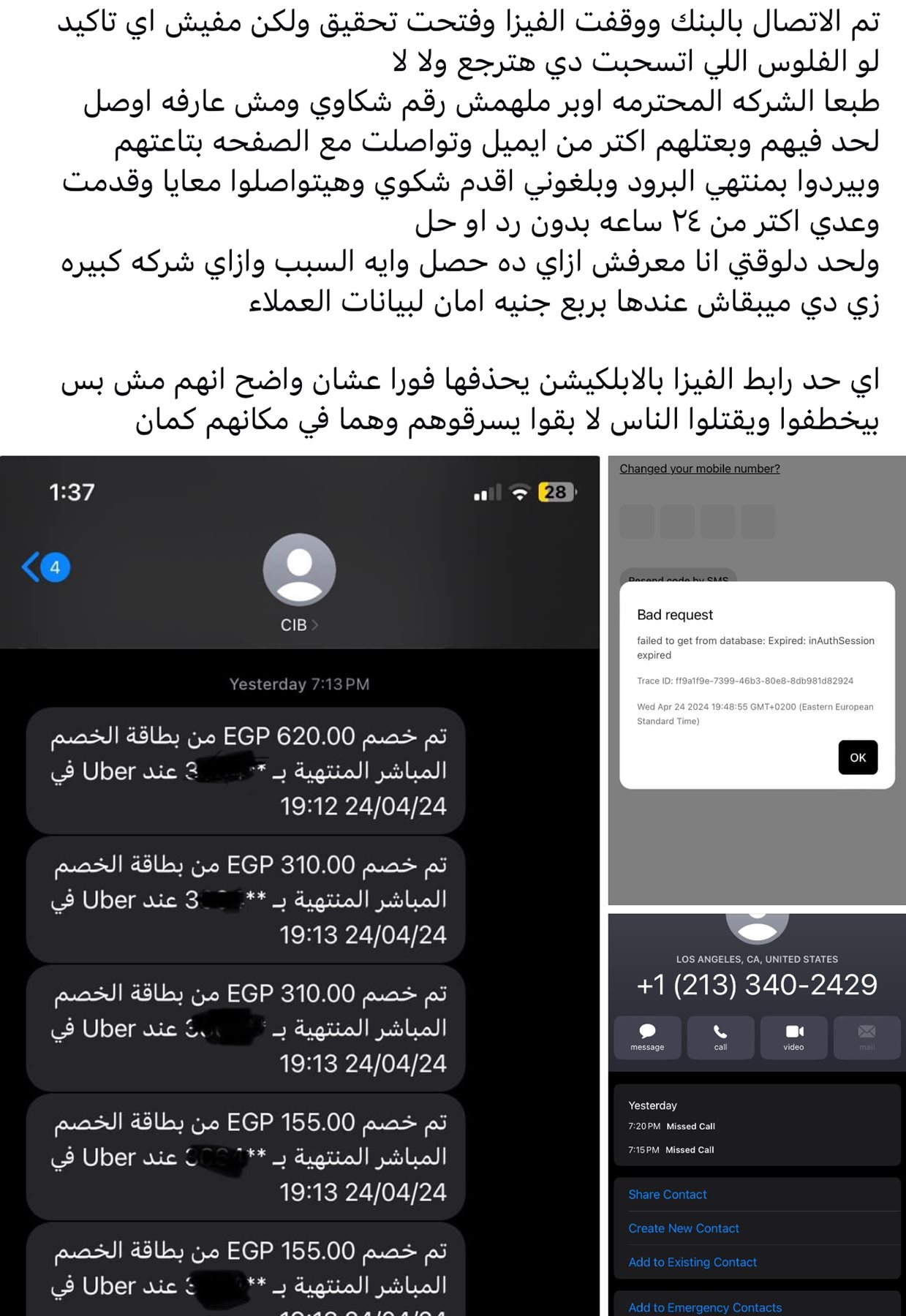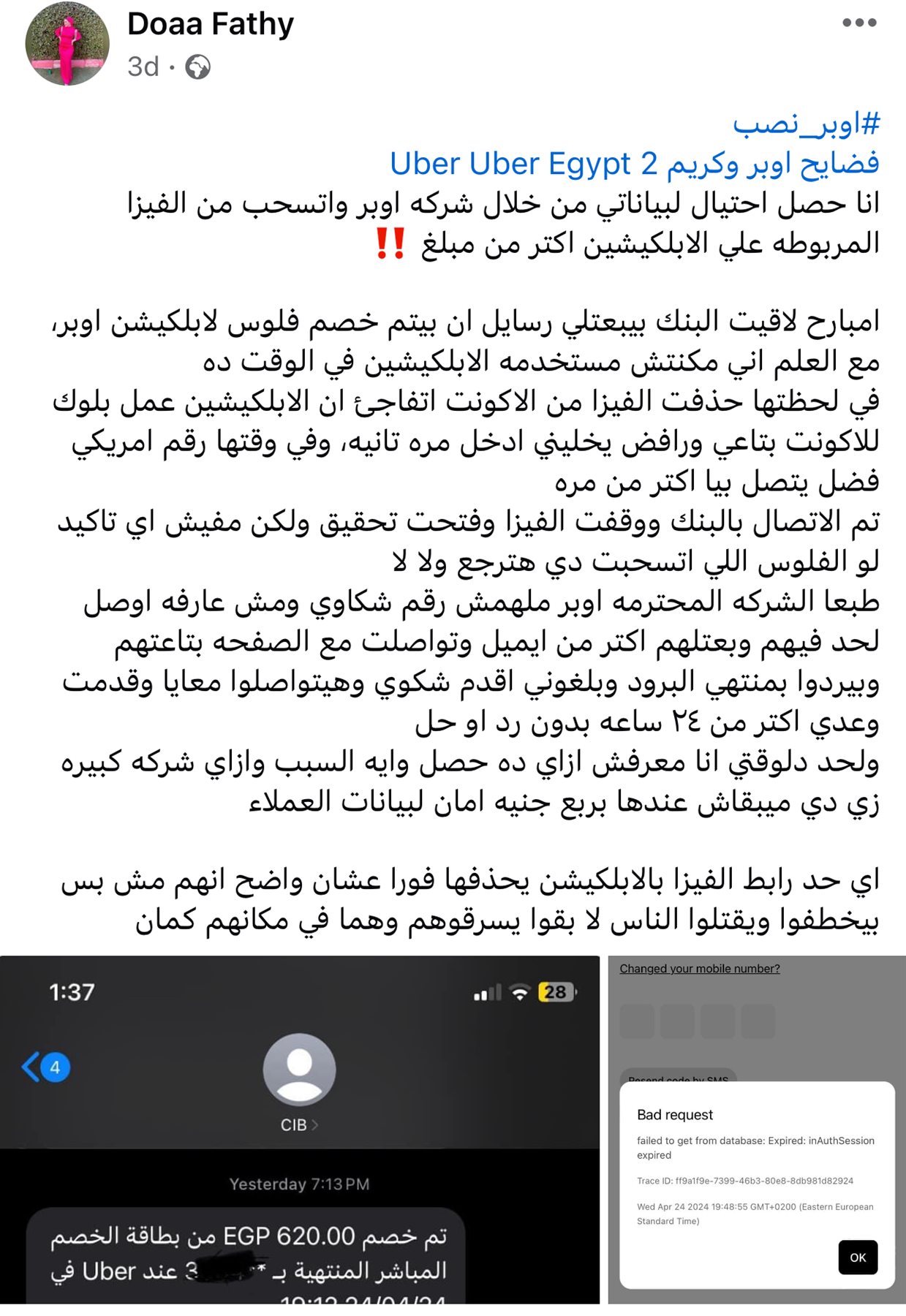 وتابعت،"تم الاتصال بالبنك ووقفت الفيزا وفتحت تحقيق ولكن مفيش اي تاكيد لو الفلوس اللي اتسحبت دي هترجع ولا لا طبعا الشركه المحترمه اوبر ملهمش رقم شكاوي ومش عارفه اوصل لحد فيهم وبعتلهم اكتر من ايميل وتواصلت مع الصفحه بتاعتهم وبيردوا بمنتهي البرود وبلغوني اقدم شكوي وهيتواصلوا معايا وقدمت وعدي اكتر من ٢٤ ساعه بدون رد او حل ولحد دلوقتي انا معرفش ازاي ده حصل وايه السبب وازاي شركه كبيره زي دي ميبقاش عندها بربع جنيه امان لبيانات العملاء ".