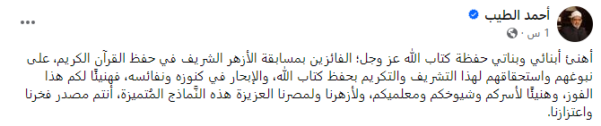 وكتب شيخ الأزهرعلى صفحته الرسمية بموقعي "فيسبوك" و "إكس": "أهنئُ أبنائي وبناتي حفظة كتاب الله -عز وجل- الفائزين بمسابقة الأزهر الشريف في حفظ القرآن الكريم، على نبوغهم واستحقاقهم لهذا التشريف والتكريم بحفظ كتاب الله والإبحار في كنوزه ونفائسه، فهنيئًا لكم بهذا الفوز، وهنيئًا لأسركم وشيوخكم ومعلميكم، ولأزهرنا ولمصرنا العزيزة بهذه النَّماذج المُتميزة، أنتم مصدر فخرنا واعتزازنا".