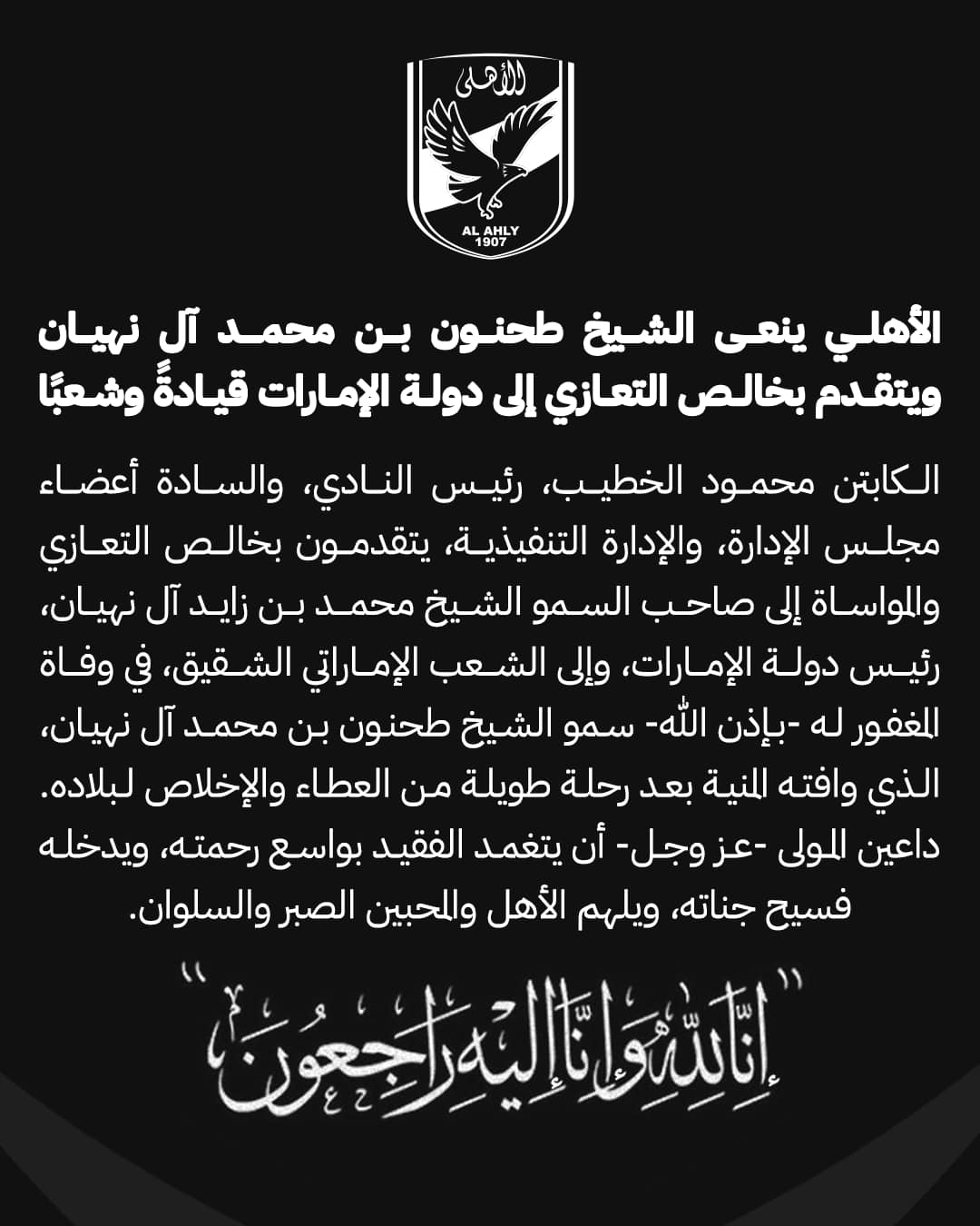 تقدم محمود الخطيب، رئيس النادي الاهلي ، وأعضاء مجلس الإدارة، والإدارة التنفيذية، بخالص التعازي والمواساة إلى صاحب السمو الشيخ محمد بن زايد آل نهيان، رئيس دولة الإمارات، وإلى الشعب الإماراتي الشقيق، في وفاة المغفور له -بإذن الله- سمو الشيخ طحنون بن محمد آل نهيان والذي وافته المنية بعد رحلة طويلة من العطاء والإخلاص لبلاده.
