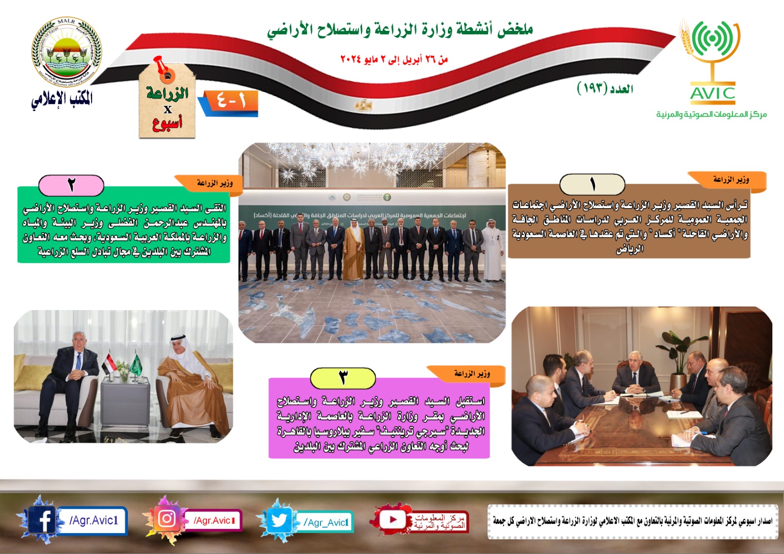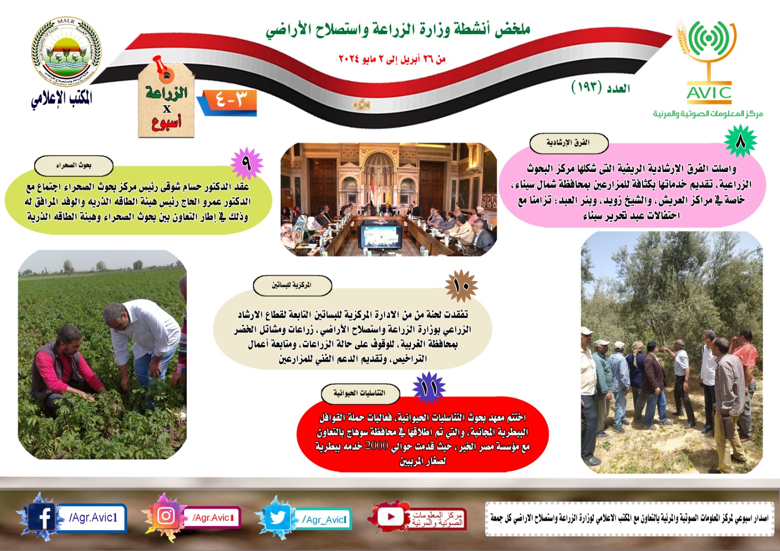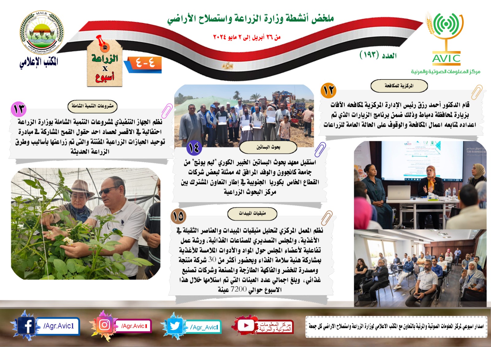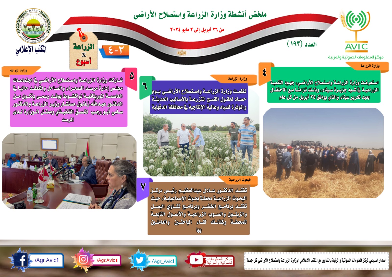 أصدر مركز المعلومات الصوتية والمرئية، التابع لوزارة الزراعة واستصلاح الاراضي، "الانفوجراف الاسبوعي" في نسخته رقم 193 حول الحصاد الاسبوعي لأهم أنشطة الوزارة، خلال الاسبوع الماضي في الفترة من 26 ابريل وحتى 2 مايو الجاري، وذلك بالتعاون مع المكتب الاعلامي للوزارة، كما أصدر المركز ايضا ملخصا بالفيديو، حول انشطة الوزارة خلال نفس الفترة.