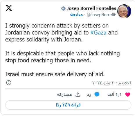 أدان مفوض السياسة الخارجية بالاتحاد الأوروبي، جوزيب بوريل بـ"شدة" هجوم مستوطنين إسرائيليين، على القافلة الأردنية التي تحمل مساعدات إلى قطاع غزة وأعرب عن "تضامنه مع الأردن".