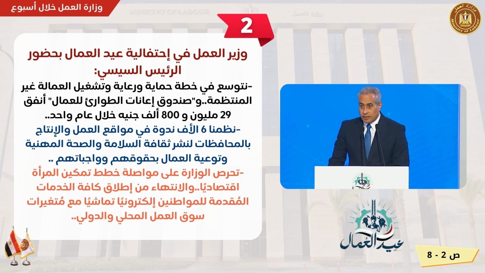 وتحدث الوزير عن أنه ،ومنذ بداية يناير 2023 حتى الأن ، بلغ عدد ندوات التوعية التي تم تقديمها للتعريف بالحقوق والواجبات ، والخدمات العمالية ، والسلامة والصحة المهنية، أكثر من 6 الاف ندوة في مواقع العمل والإنتاج بالمحافظات ..وتقوم الوزارة بمواصلة التفتيش على جميع المُنشأت الحكومية والخاصة ..بهدف إحكام مبادئ السلامة والصحة المهنية ..للحفاظ على سلامة العاملين ..والألات والمُعدات ..وذلك لخفض مُعدلات الإصابة ..أما على مستوى الحماية والرعاية الاجتماعية للعاملين ومساندة المنشآت المتعثرة، قال :إن صندوق إعانات الطوارئ للعمال ،أنفق خلال الفترة من 1 مايو 2023 وحتى الان وث، وذلك في إطار الدور القومي للصندوق بالوفاء بأجور العمال الذين تتعرض شركاتهم لبعض الأزمات والتحديات وتتعثر في الوفاء بأجورهم، وذلك لحين استعادة استقرارها."..وقال الوزير إن الوزارة تحرص على تمكين المرأة اقتصاديًا.. بتأهيلهن لسوق العمل،و إقامة مشروعات صغيرة..والتوعية بالحقوق والواجبات داخل مواقع العمل والإنتاج...كما تواصل وزارة العمل تنفيذ خطط الانتهاء من إطلاق كافة الخدمات المُقدمة للمواطنين إلكترونيًا، وبشكل كامل،على بوابة مصر الرقمية... وذلك في إطار خطة الدولة نحو التحول الرقمي وعالم التكنولوجيا، وتماشيًا مع المتغيرات التي طرأت على سوق العمل المحلي والدولي.