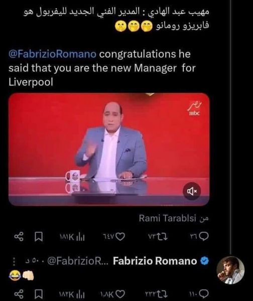 وأكمل: "المدير الفني الجديد لفريق ليفربول اسمه فابريتسيو رومانو" .