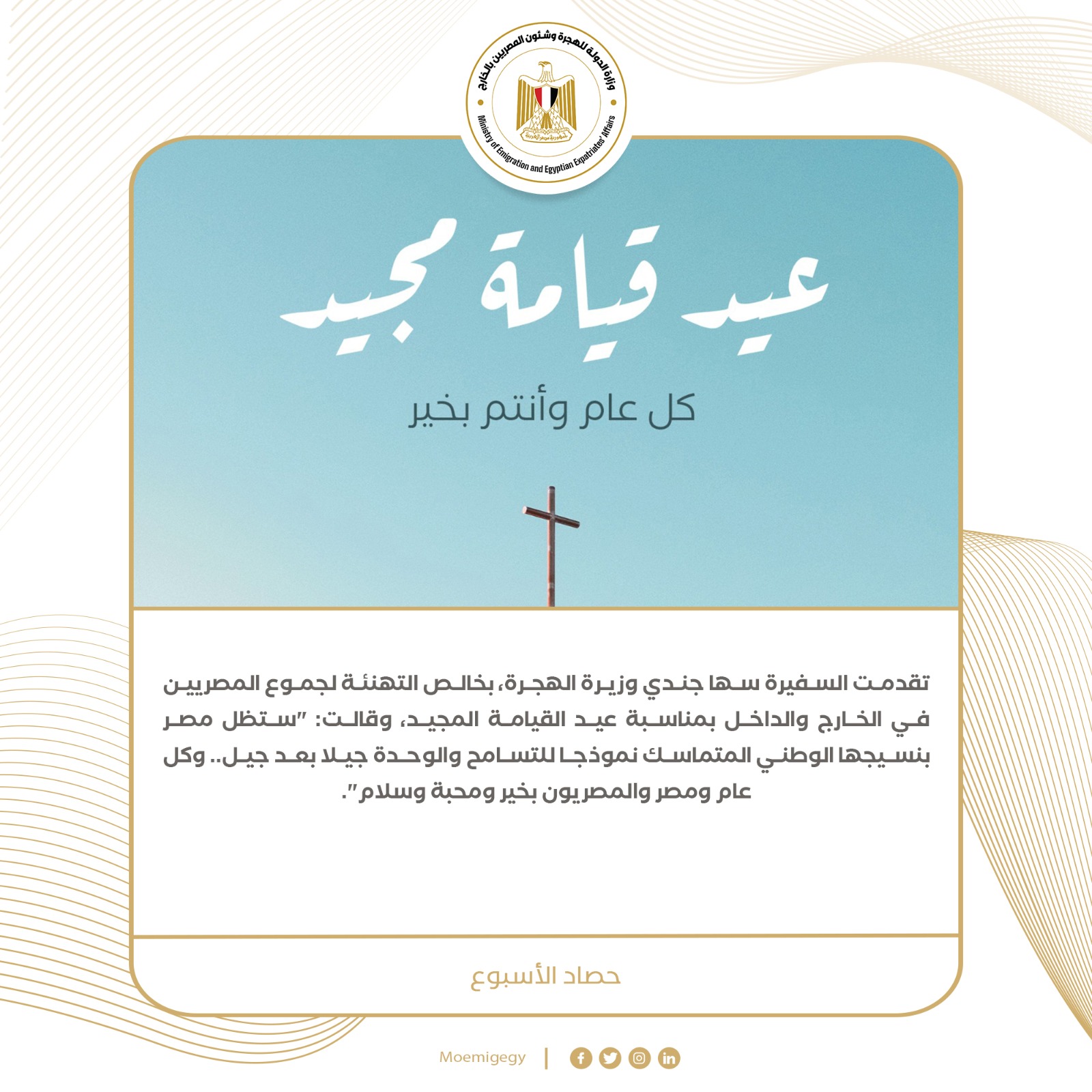 1- تقدمت السفيرة سها جندي وزيرة الهجرة، بخالص التهنئة لجموع المصريين في الخارج والداخل بمناسبة عيد القيامة المجيد، وقالت: "ستظل مصر بنسيجها الوطني المتماسك نموذجا للتسامح والوحدة جيلا بعد جيل.. وكل عام ومصر والمصريون بخير ومحبة وسلام".