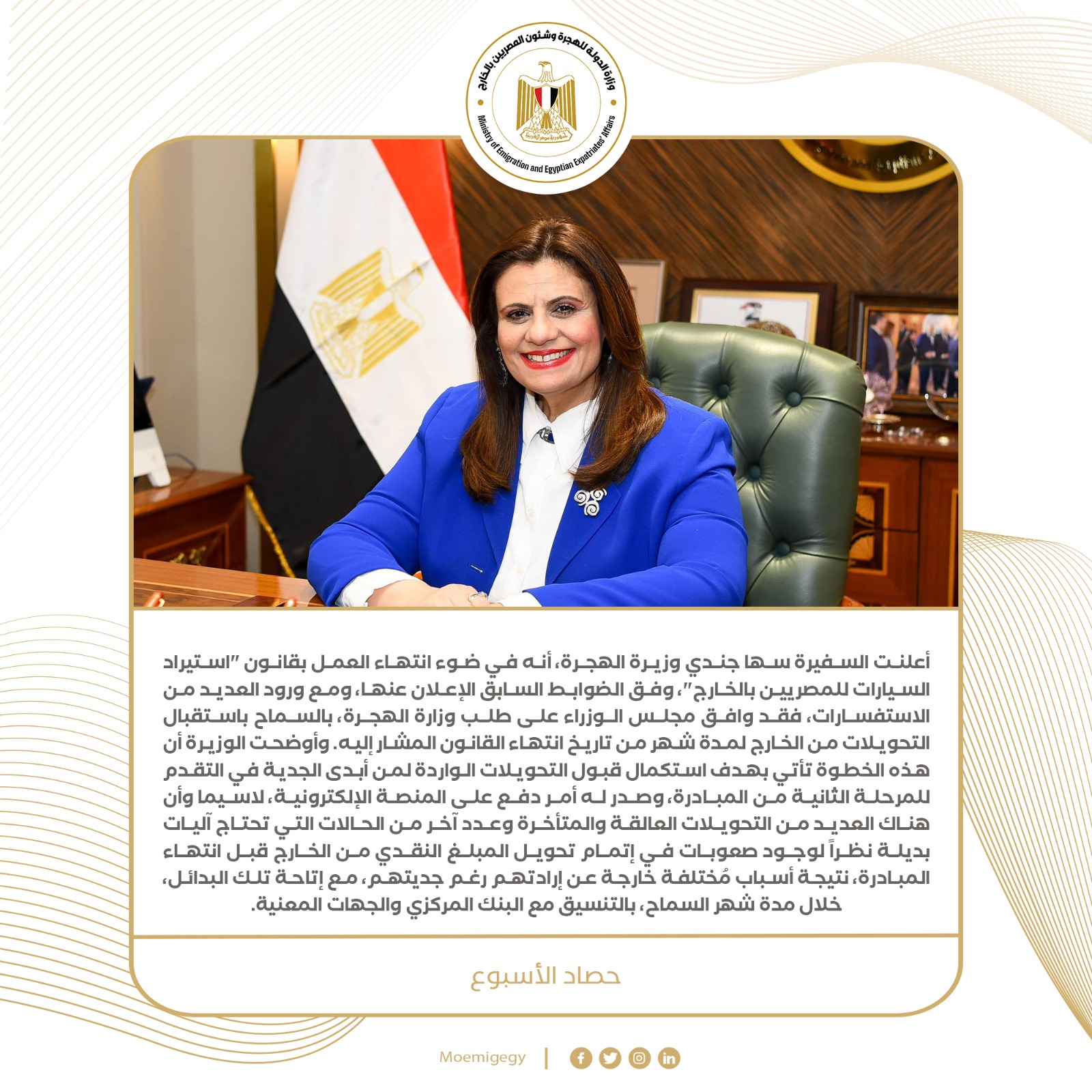 2- أعلنت السفيرة سها جندي وزيرة الهجرة، أنه في ضوء انتهاء العمل بقانون "استيراد السيارات للمصريين بالخارج"، وفق الضوابط السابق الإعلان عنها، ومع ورود العديد من الاستفسارات، فقد وافق مجلس الوزراء على طلب وزارة الهجرة، بالسماح باستقبال التحويلات من الخارج لمدة شهر من تاريخ انتهاء القانون المشار إليه. وأوضحت الوزيرة أن هذه الخطوة تأتي بهدف استكمال قبول التحويلات الواردة لمن أبدى الجدية في التقدم للمرحلة الثانية من المبادرة، وصدر له أمر دفع على المنصة الإلكترونية، لاسيما وأن هناك العديد من التحويلات العالقة والمتأخرة وعدد آخر من الحالات التي تحتاج آليات بديلة نظراً لوجود صعوبات في إتمام تحويل المبلغ النقدي من الخارج قبل انتهاء المبادرة، نتيجة أسباب مُختلفة خارجة عن إرادتهم رغم جديتهم، مع إتاحة تلك البدائل، خلال مدة شهر السماح، بالتنسيق مع البنك المركزي والجهات المعنية.