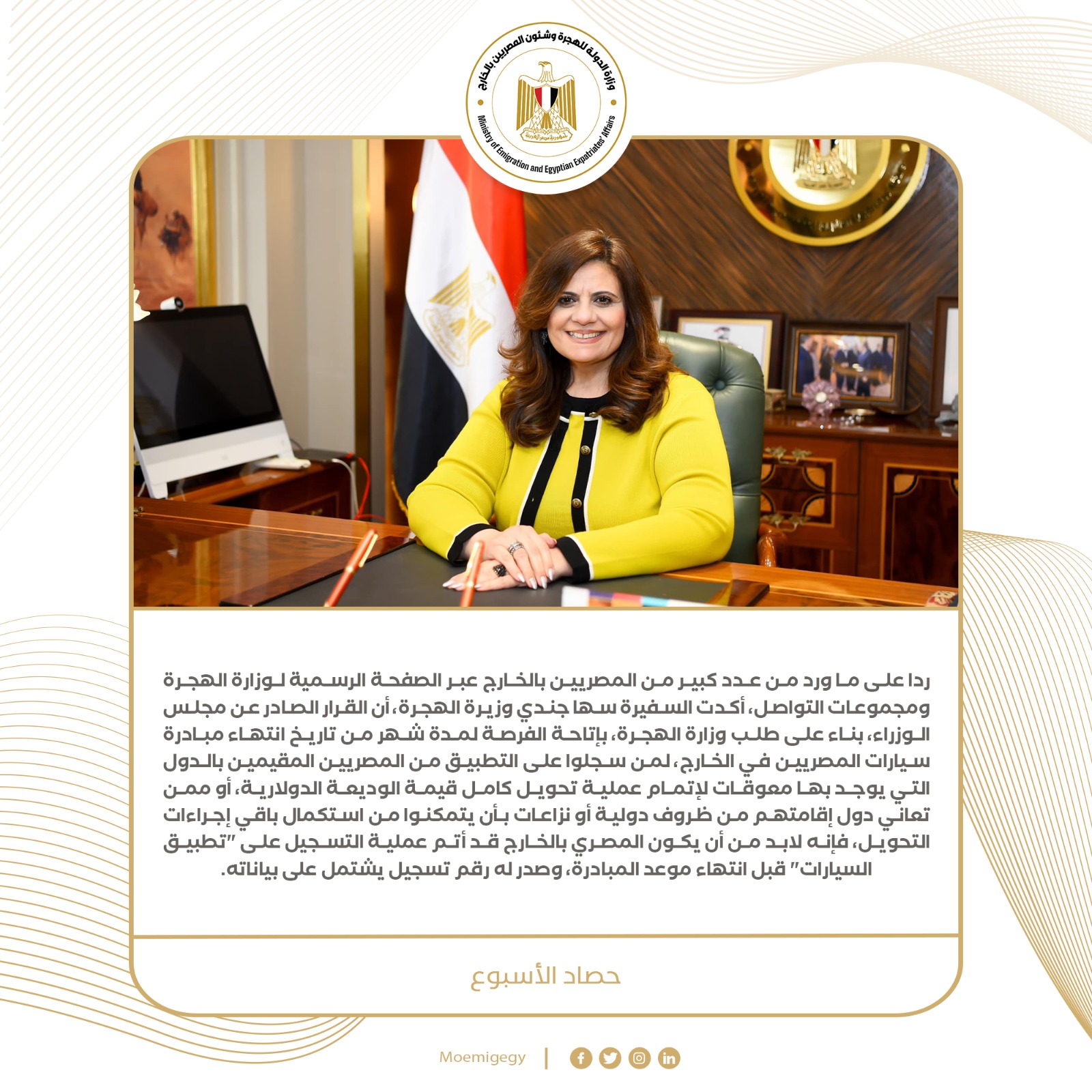 3- ردا على ما ورد من عدد كبير من المصريين بالخارج عبر الصفحة الرسمية لوزارة الهجرة ومجموعات التواصل، أكدت السفيرة سها جندي وزيرة الهجرة، أن القرار الصادر عن مجلس الوزراء، بناء على طلب وزارة الهجرة، بإتاحة الفرصة لمدة شهر من تاريخ انتهاء مبادرة سيارات المصريين في الخارج، لمن سجلوا على التطبيق من المصريين المقيمين بالدول التي يوجد بها معوقات لإتمام عملية تحويل كامل قيمة الوديعة الدولارية، أو ممن تعاني دول إقامتهم من ظروف دولية أو نزاعات بأن يتمكنوا من استكمال باقي إجراءات التحويل، فإنه لابد من أن يكون المصري بالخارج قد أتم عملية التسجيل على "تطبيق السيارات" قبل انتهاء موعد المبادرة، وصدر له رقم تسجيل يشتمل على بياناته.