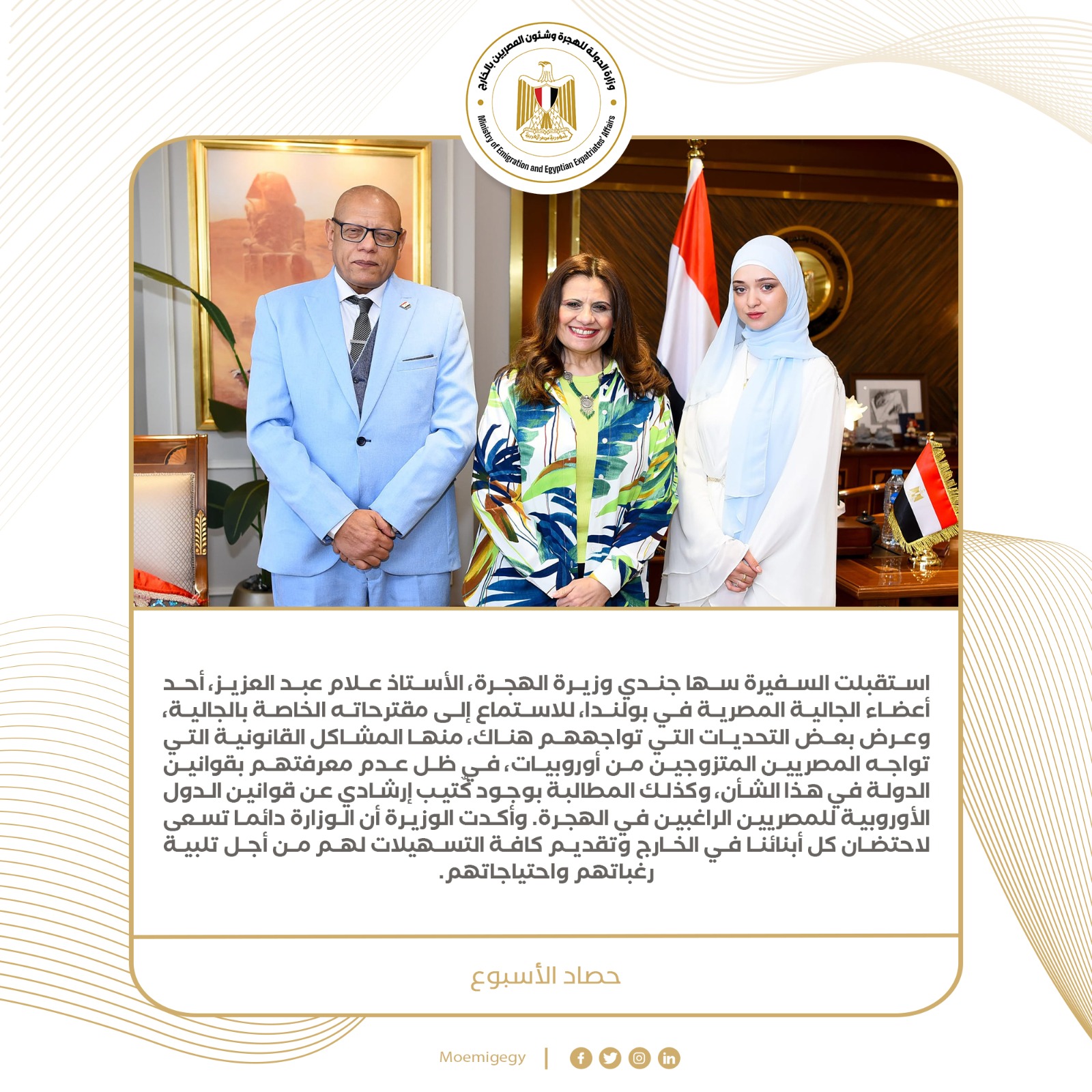 6- استقبلت السفيرة سها جندي وزيرة الهجرة، الأستاذ علام عبد العزيز، أحد أعضاء الجالية المصرية في بولندا، للاستماع إلى مقترحاته الخاصة بالجالية، وعرض بعض التحديات التي تواجههم هناك، منها المشاكل القانونية التي تواجه المصريين المتزوجين من أوروبيات، في ظل عدم معرفتهم بقوانين الدولة في هذا الشأن، وكذلك المطالبة بوجود كٌتيب إرشادي عن قوانين الدول الأوروبية للمصريين الراغبين في الهجرة. وأكدت الوزيرة أن الوزارة دائما تسعى لاحتضان كل أبنائنا في الخارج وتقديم كافة التسهيلات لهم من أجل تلبية رغباتهم واحتياجاتهم.