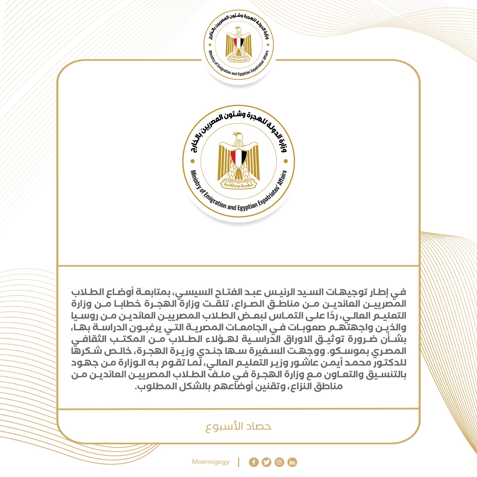 7- في إطار توجيهات السيد الرئيس عبد الفتاح السيسي، بمتابعة أوضاع الطلاب المصريين العائدين من مناطق الصراع، تلقت وزارة الهجرة خطابا من وزارة التعليم العالي، ردًا على التماس لبعض الطلاب المصريين العائدين من روسيا والذين واجهتهم صعوبات في الجامعات المصرية التي يرغبون الدراسة بها، بشأن ضرورة توثيق الاوراق الدراسية لهؤلاء الطلاب من المكتب الثقافي المصري بموسكو. ووجهت السفيرة سها جندي وزيرة الهجرة، خالص شكرها للدكتور محمد أيمن عاشور وزير التعليم العالي، لما تقوم به الوزارة من جهود بالتنسيق والتعاون مع وزارة الهجرة في ملف الطلاب المصريين العائدين من مناطق النزاع، وتقنين أوضاعهم بالشكل المطلوب.